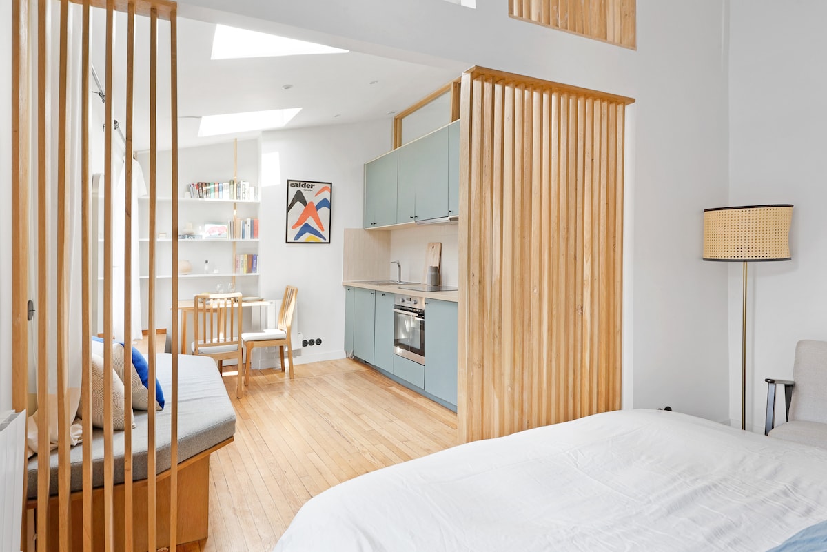 Discover the charm of Paris in my cozy 1-BR apartment in Le Haut Marais. This retreat in the heart of the city is inspired by my many travels over the years. It offers a living/dining area, a fully-equipped American kitchen, and a comfortable bedroom. Steps away from iconic attractions, cafes, and boutiques. Ideal for those looking to immerse in the Parisian lifestyle.