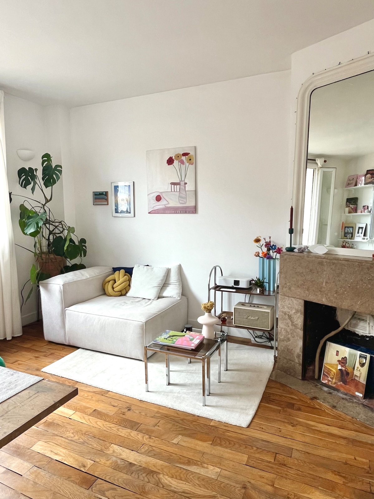 Charming 42 m2 apartment, cozy with vintage furniture in the heart of the 19th arrondissement. Ideally located between the most beautiful park in Paris: Buttes-Chaumont and the banks of the Canal de l'Ourq – Quai de Loire. It consists of an entrance with separate toilet and equipped kitchen, a nice living room, a bedroom with queen size bed and bathroom with window. Quiet, on a courtyard. The neighborhood is very cute and dynamic, all shops and the metro are at the foot of the building.