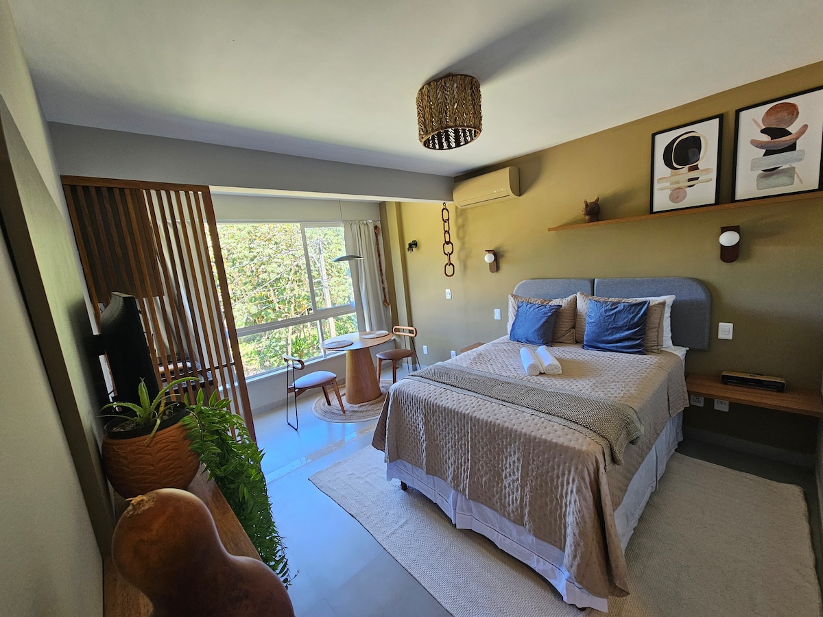 Newly built apartment, 100 m² of private area!! 50 m² between fully equipped living room-kitchen with sofa-bed and 40" SmartTV with SKY; and en-suite with king-size bed and 43" 4k SmartTV; and a 50 m² balcony with a private pool and a view of the Atlantic Forest. All rooms are spacious, air-conditioned and with Wi-Fi. Located at the beginning of the 3rd beach, 2 minutes from the sea, it is the right place to enjoy Morro; close to a supermarket, bars and restaurants, but in a quiet residential area.