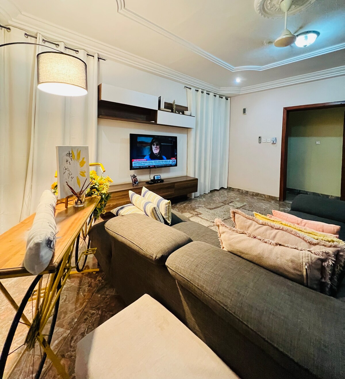 Modern comfort in a stylish, beautifully lit apartment with clean contemporary finish & a warm evening glow that instantly feels upscale & inviting. Located in a quiet neighborhood 19mins from the Airport, 17 from accra mall,10mins from Atlantic Mall, and about 30 mins from the Aburi Mountains, offering easy access to shops, business hubs & leisure centers ..You’re never far away from everything you need yet still tucked away enough to relax & unwind. A chic retreat you’ll love coming home to.