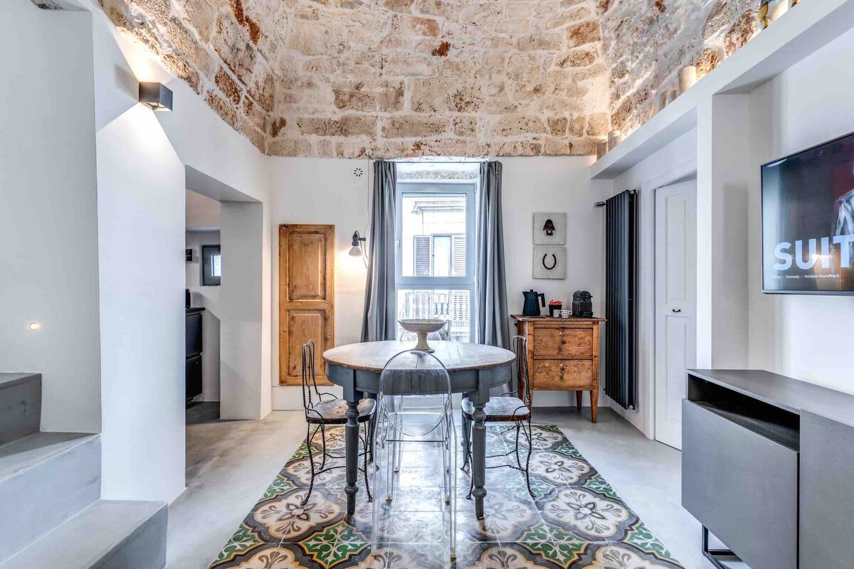 CIS: BR07401291000000188 CIN: IT074012B400033730 Vivi la magica sensazione di trovarti tra passato e presente: è una dimora storica! I pavimenti d'epoca e le pareti in pietra fanno da sfondo a un ambiente arredato con oggetti di design, vecchie ceramiche e mobili locali. L'ampio terrazzo privato, con solarium e doccia calda, saprà entusiasmarti: potrai rilassarti con un bicchiere di vino al tramonto, godere del sole su comodi lettini o preparare una cena in una magica atmosfera pugliese.