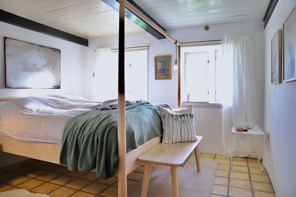 Atma guesthouse is an old farm house that has been carefully renovated in 2022. There are 3 rooms in total, a shared kitchen & 2 shared bathrooms. There is also a space for yoga, meditation and other embodiment practices which you can use. The farm is situated on the outskirts of the little village of Ommel. The surrounding fields and view over the ocean will make you experience Ærø in all its beauty. We grow organic vegetables in the kitchen garden and our chicken have recently moved in.
