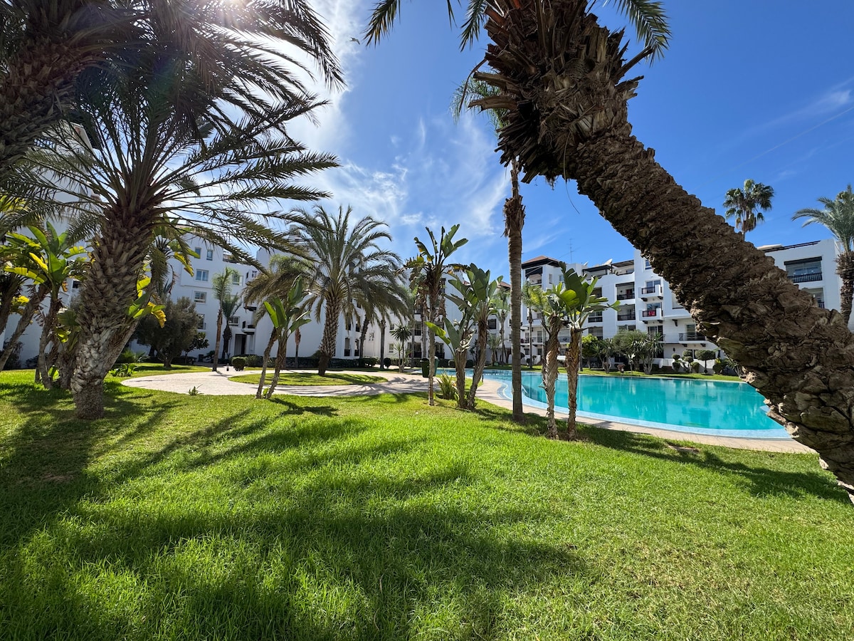 🌞 Appartement ensoleillé plein sud avec vue dégagée sur la piscine, situé au cœur de la Marina d’Agadir. Dans une résidence calme, sécurisée et très recherchée, avec piscines, jardins et accès direct à la plage. Idéal pour un séjour reposant en couple, en famille, entre amis ou pour un séjour prolongé. Restaurants gastronomiques, street-food salons de thé et commerces à pieds Sunny south-facing apartment with a pool view, located in the heart of Agadir Marina.