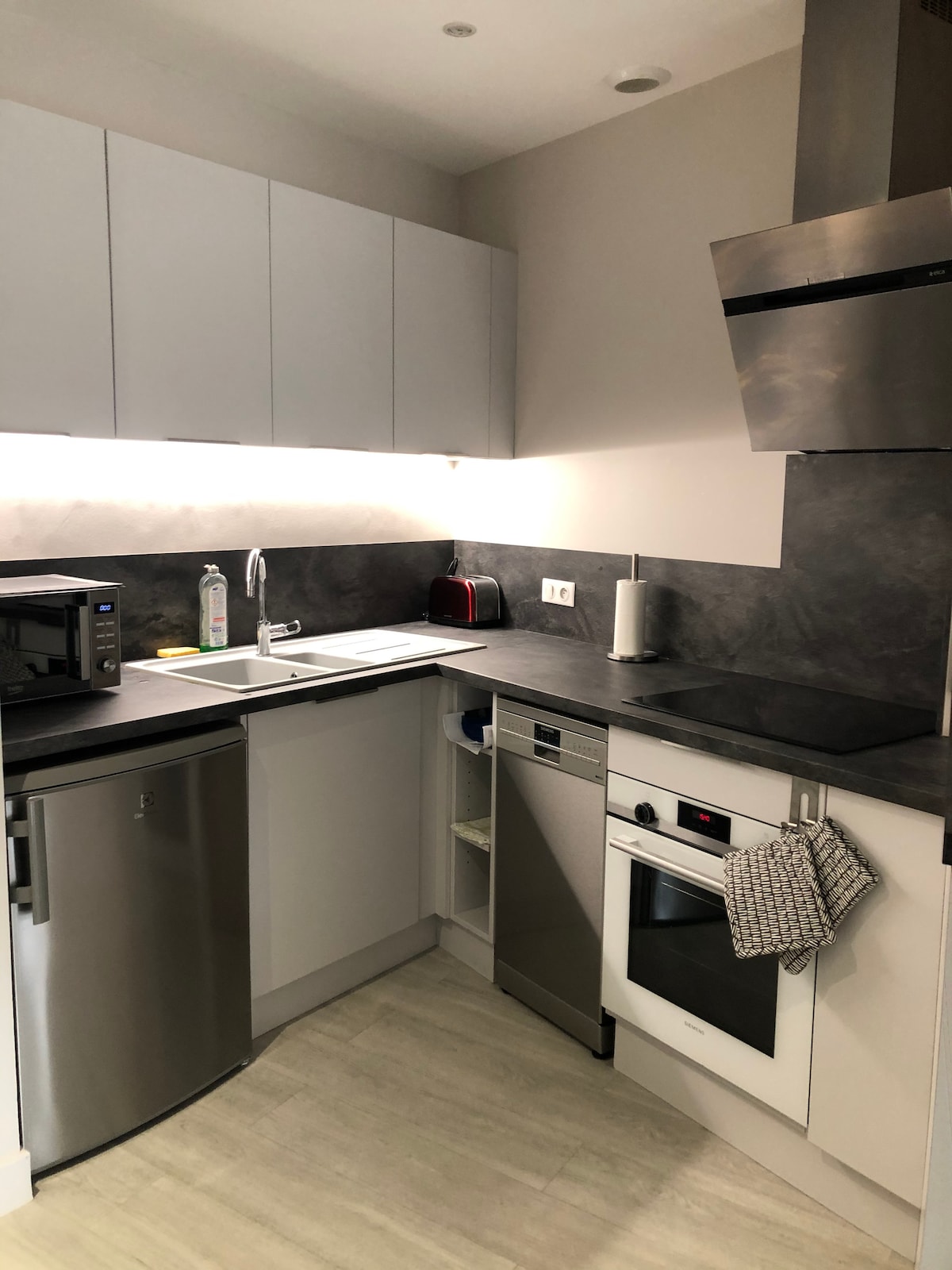 Large, very bright, air-conditioned 2-room apartment in the heart of the city, 2 steps from all amenities (restaurants, shops...) The train station is within a 10-minute walk. The entrance to the apartment is self-contained by a lockbox and a keypad. The apartment is brand new with hotel-quality bedding in 160 x 200 and has 2 separate toilets Designer furniture, perfectly equipped kitchen: induction stove, oven, Nespresso coffee machine, kettle, toaster, LV