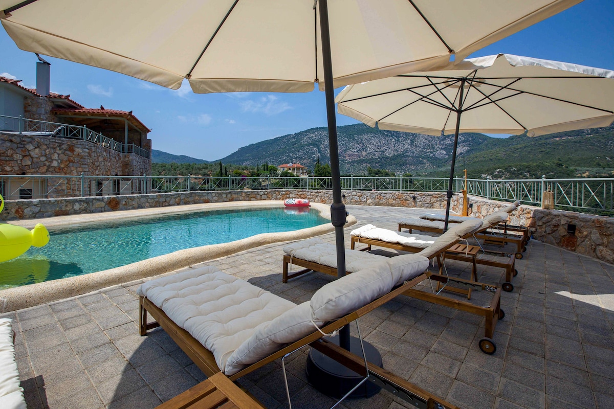 A beautiful seafront fully furniched three level NEW house in a relaxing very private location with 2 infinity swimming pools and lounging equipment, offer guests great comfort for their stay. The location is ideal for family or friends to enjoy high quality architecture and astonishing panoramic sea view behind to a quit beach , Here the sea meets the sky and the mountain dives into the sea, a poem without words .Near in Athens, Epidaurus, Nafplio, Mikines.