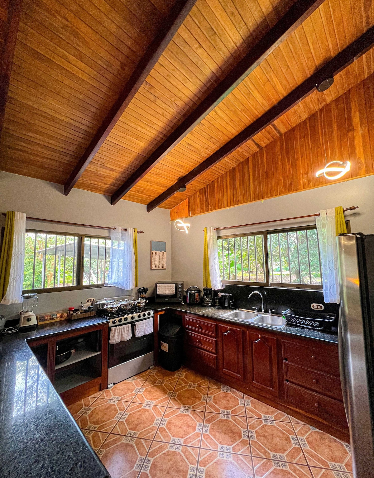 Casa del Bambu: A spacious retreat with a king bed in the bedroom, a twin bed in the living room (another second twin bed upon request), A/C, two smart TVs, high-speed Starlink WiFi, a large bath with a hot shower, and hot water at every faucet. Enjoy cooking in the fully equipped, screened-in semi-outdoor kitchen and unwind on the serene terrace amid lush landscaped gardens, just a 5-minute drive to Puerto Jiménez, close to beaches, restaurants, banks, and amenities.