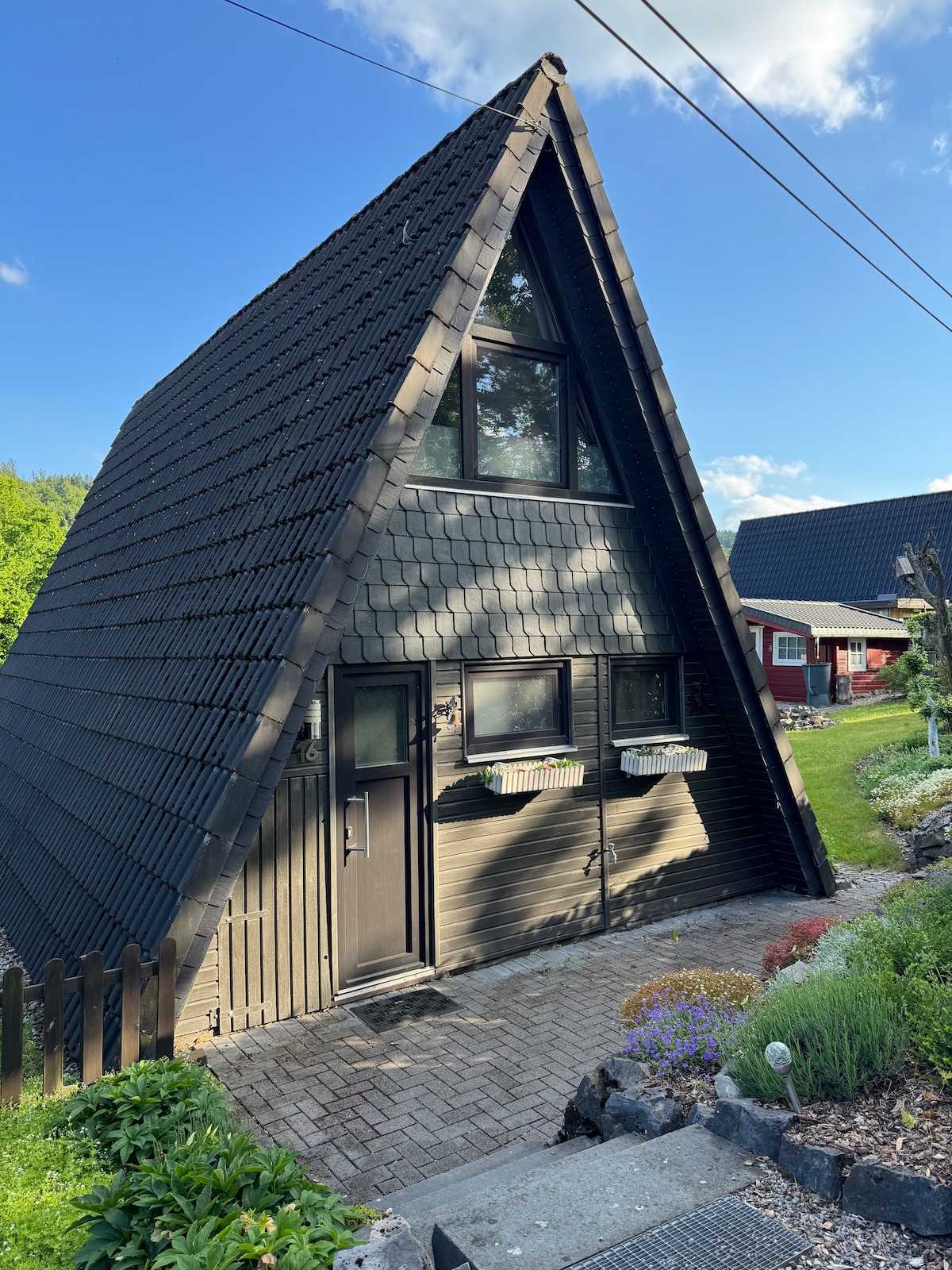 The cozy vacation home Gabi is located above the Hennesee & offers a beautiful view of the Sauerland landscape. It is completely made of wood inside and exudes cozy comfort in a rustic atmosphere. Cozy like 30 years ago! It offers a living room with integrated kitchen, two bedrooms with TEMPUR mattresses, sofa bed in the living room & a bunk bed, so it can accommodate 5-6 guests. The 2 terraces & the garden invite you to linger with a wonderful view.