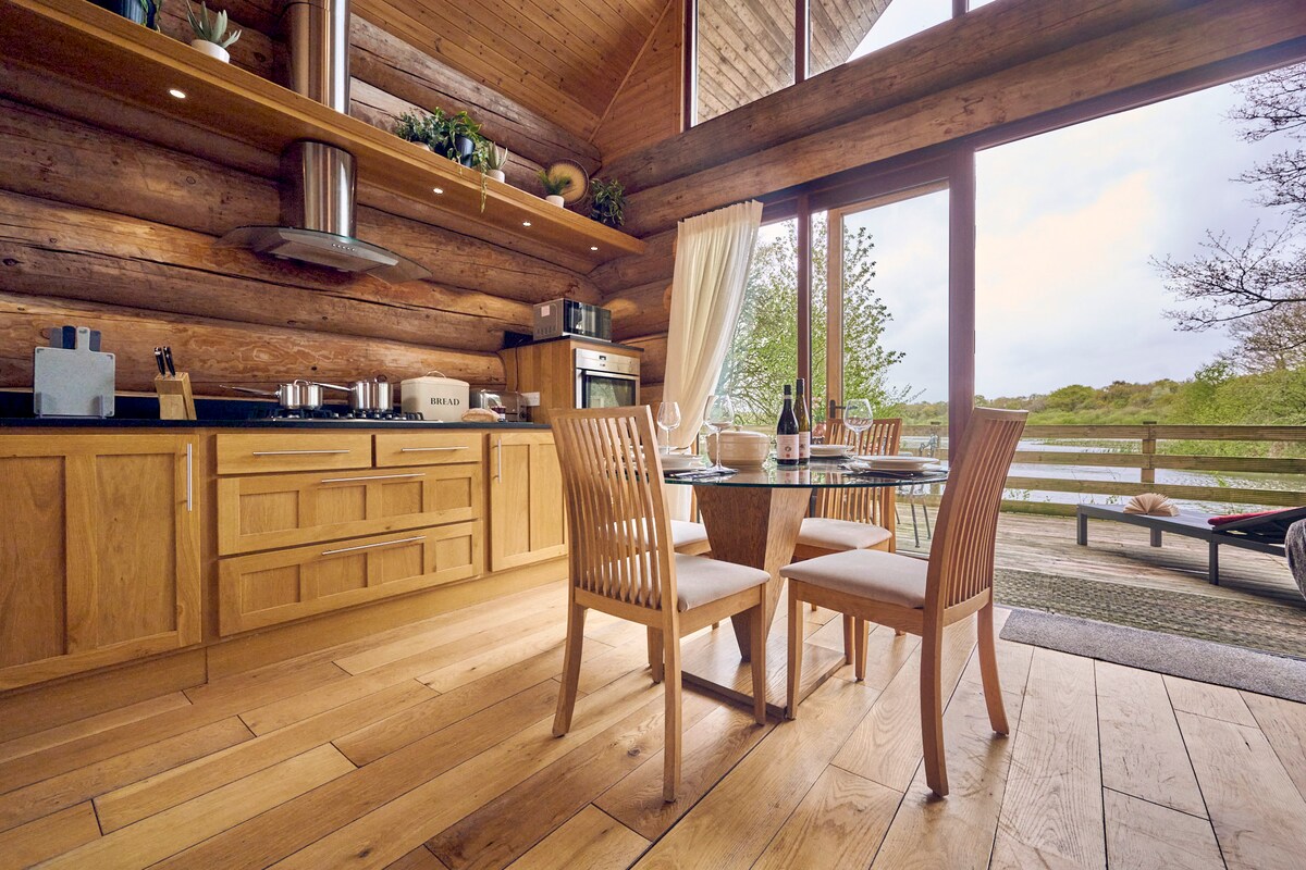 The Hide Lodge is a stylish space, designed with relaxing and retreating in mind. It is cosy and warm with underfloor heating. The open plan lounge and living area has full width bi-fold doors, which allows the space to be fully opened up to feel like part of the woodland beyond. The main bedroom boasts sliding french doors, also overlooking the woodland and stream, with a bath placed to enjoy this view. There is a private terrace and patio area to enjoy al-fresco dining or star-gazing.