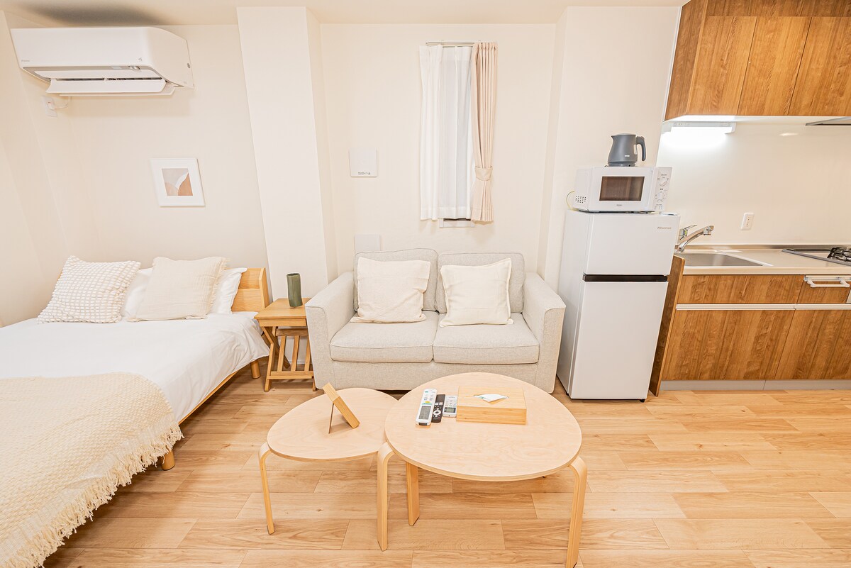 Enjoy a private stay in a licensed accommodation next to a 24-hour Lawson. Just 30 minutes by train to Tokyo Station. Free bikes, Wi-Fi, Amazon TV, a ¥1,000 breakfast voucher, and a complimentary taxi from Kawaguchi Station on check-in day. The cabin does not have a kitchen, so you will likely dine out or use ready-made meals. The room is simple, with two beds and two small desks. It is also equipped with a refrigerator and air conditioner, as well as a private toilet and shower room.