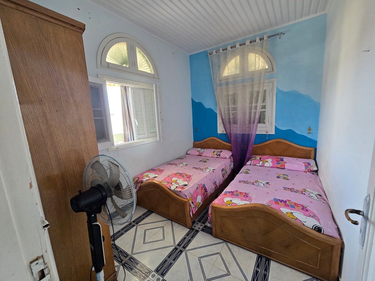 Charming design, view and location. The apartment provides all the pleasures and perks. A fully furnished private residence. Perfect for weekend getaways, business trips and work from home or cozy home base while exploring everything in ras el bar and damietta. Unbeatable location 5 mins walk to beach and pool with access to restaurant, cafe, mosque and market. 5 mins drive to nearby aquapark, circus and amusement park 10 mins drive to city center 20 mins to damietta 30 mins to New Damietta