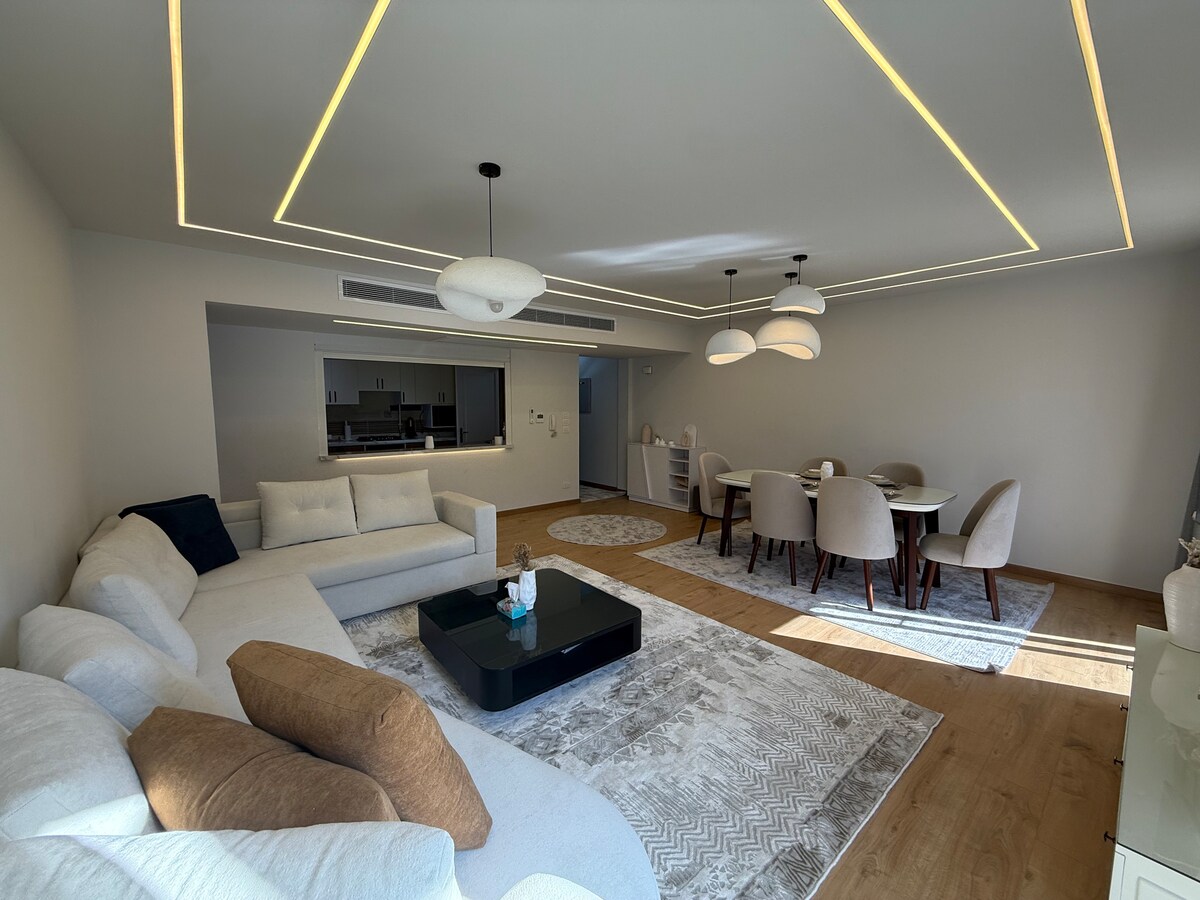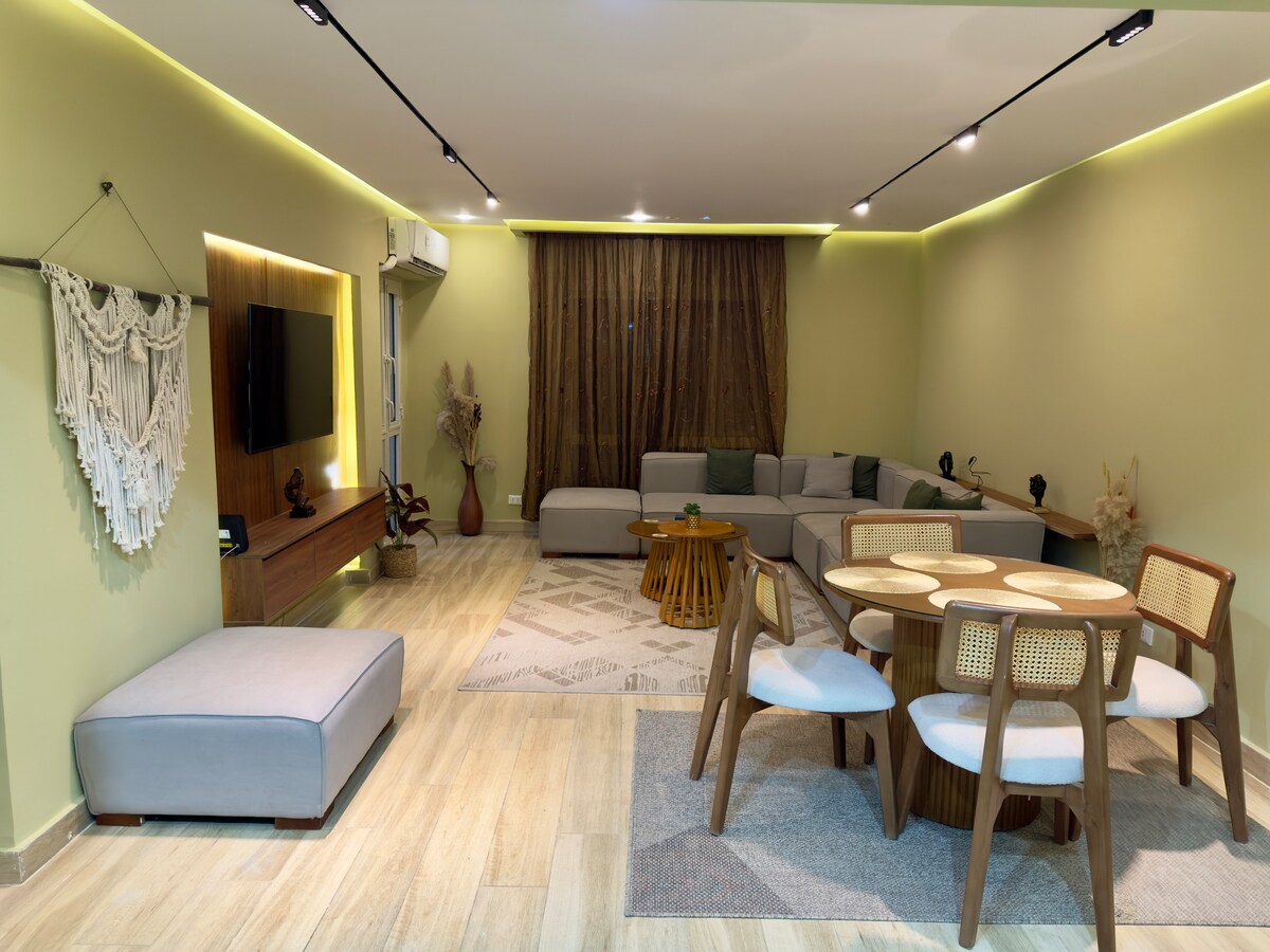 Welcome to your perfect getaway! This stylish apartment has 2 bedrooms and a chic reception area, making it ideal for families or groups of friends. Stay cool and comfy with air conditioning,perfect for those hot summer days. The trendy decor and cozy vibe make it feel just like home. Relax with a stunning garden view that melts away the day's stress. Start your mornings in our cozy balcony. ** Prime Location: Directly in front of The east market and The food Court ** *15 mins from Airport*