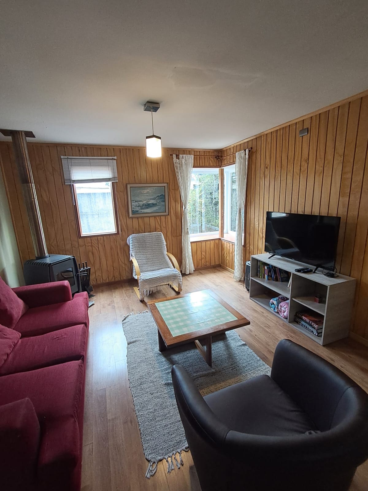 Spectacular shed house on a 5,000-square-meter plot in the Lomas del Sur condominium, very secure and with controlled access, a maximum of 20 minutes from downtown Puerto Varas. It has 6 bedrooms, 2 en suite, and is equipped to comfortably accommodate up to 14 people. The house features a fully equipped kitchen, a wood-burning stove, a pellet heater, a gas grill, Wi-Fi, and a television in the common areas and two of the bedrooms. If you have any questions, please contact us.
