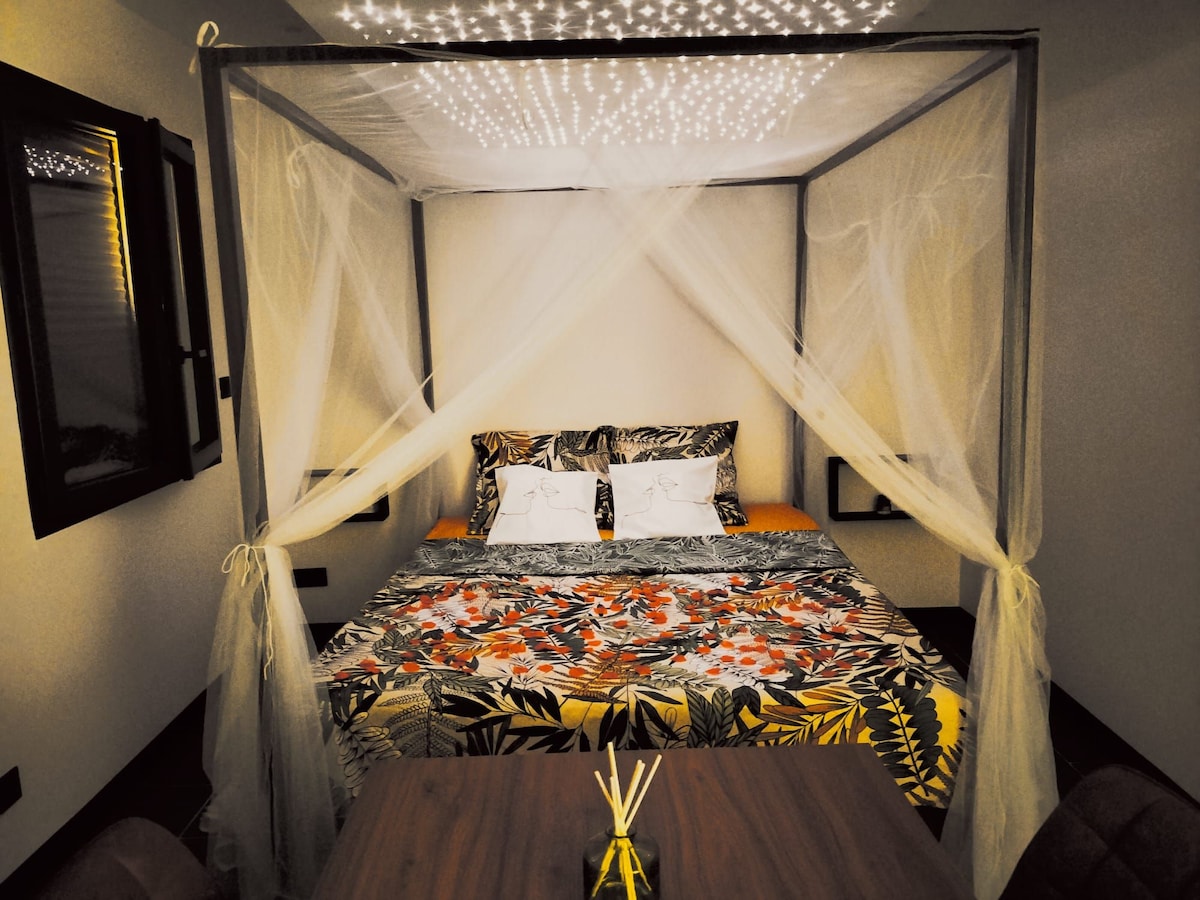 Suite de caractère située entre Nîmes et Montpellier et à 30 min des plages. Complètement dédiée à l’évasion, au repos et à la relaxation. Vous y trouverez tout le confort, un lit baldaquin queen, un vrai Jacuzzi américain 3 places, une cheminée électrique, une Tv 55', un canapé-lit, wifi et Netflix. Dans la salle de bain, vous trouverez une double vasque ainsi qu une douche. Dans la cuisine, tout le nécessaire pour réchauffer vos plats vous attend. Inclus place privée.