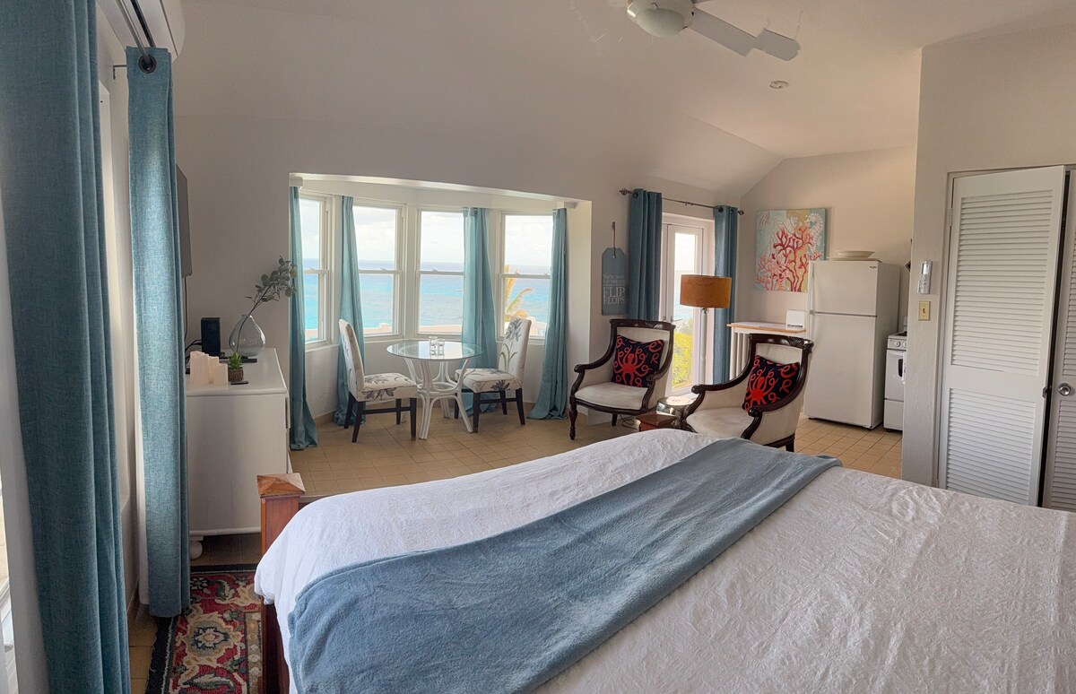 Nestled in the heart of Somerset Village, our contemporary studio offers breathtaking views of Long Bay from one of Bermuda's highest point. Wake up to serene ocean vistas and enjoy your morning coffee on the private balcony. The studio features a comfortable queen-sized bed, a fully equipped kitchenette, and modern bathroom facilities. Just a short walk away, explore scenic walks on the trail ways, restaurants and the pristine beaches Bermuda is renowned for.