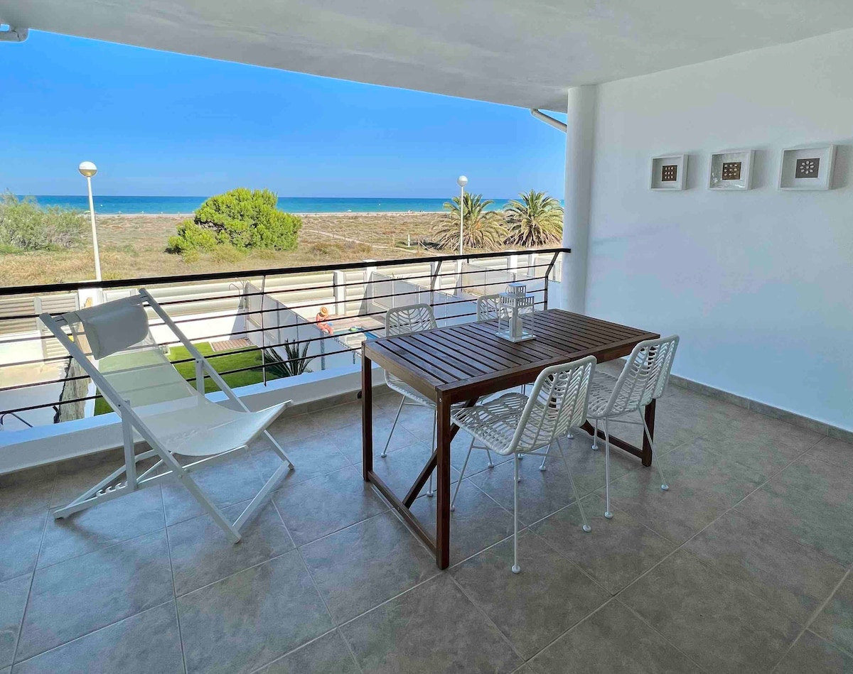 3 floor townhouse facing the sea with private pool, with sea views. Located on a beach with blue flag quality water. Flat with porch, three bedrooms, three bathrooms, three terraces. Double bedroom with terrace overlooking the sea. Double bed, four single beds. Porch with outdoor dining table with sofa and chairs. Perfect for digital nomads. Enjoy the sea breeze on the terrace eating a Valencian paella.