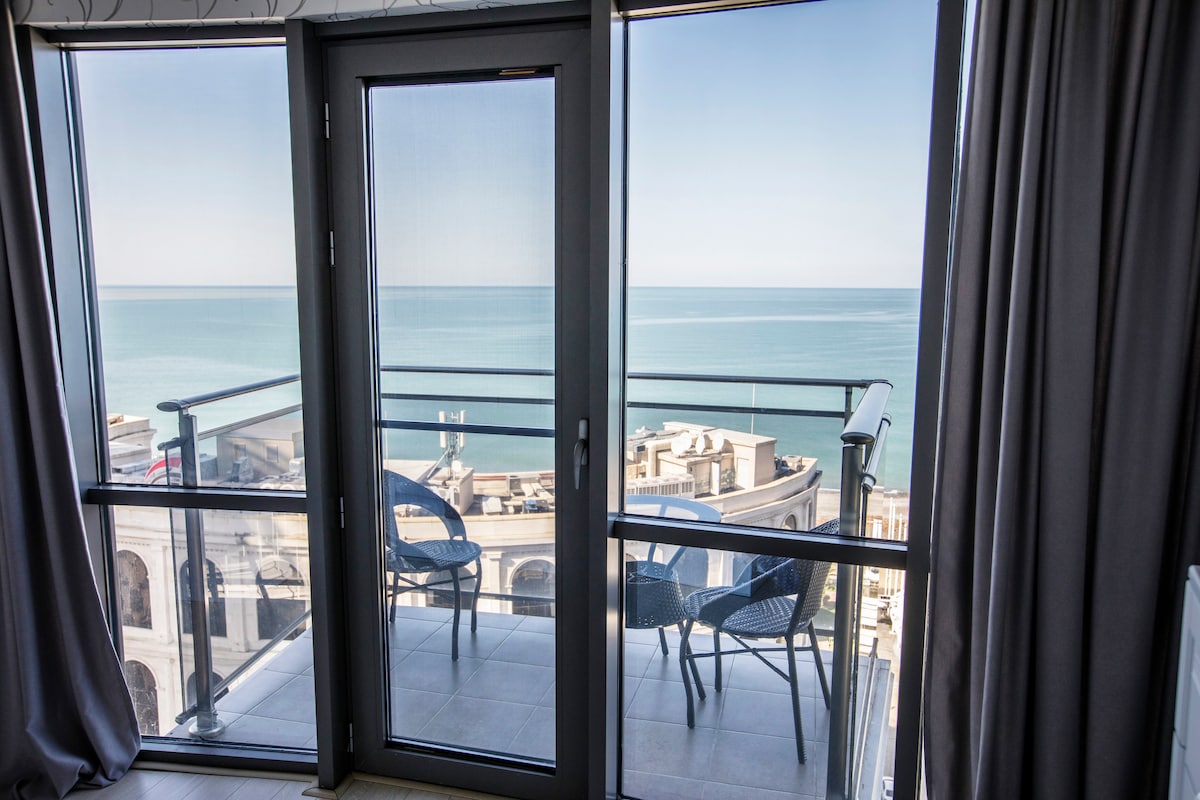A balcony view features a glass table with two chairs, overlooking the expansive Black Sea and distant mountains. A large Ferris wheel is visible in the foreground, adding a vibrant element to the serene landscape.