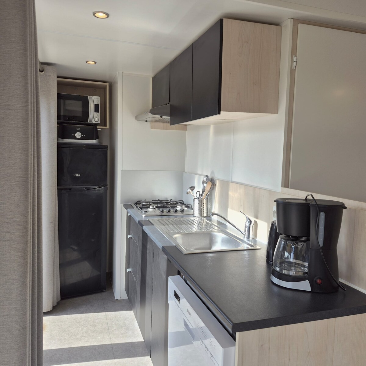 MOBILE HOME 6 people 40 m² with reversible air conditioning, large enclosed outdoor terrace with 1 secure gate, garden furniture, 2 deckchairs. Large living room with adjustable TV, 1 2-seater sofa bed, 2 large bedrooms including 1 master bedroom, premium bedding with large dressing room and TV Equipped kitchen, dishes, oven, microwave, stove, fridge with freezer, toaster, kettle, filter coffee machine and TASSIMO pods, dishwasher, washing machine and clothes rack.