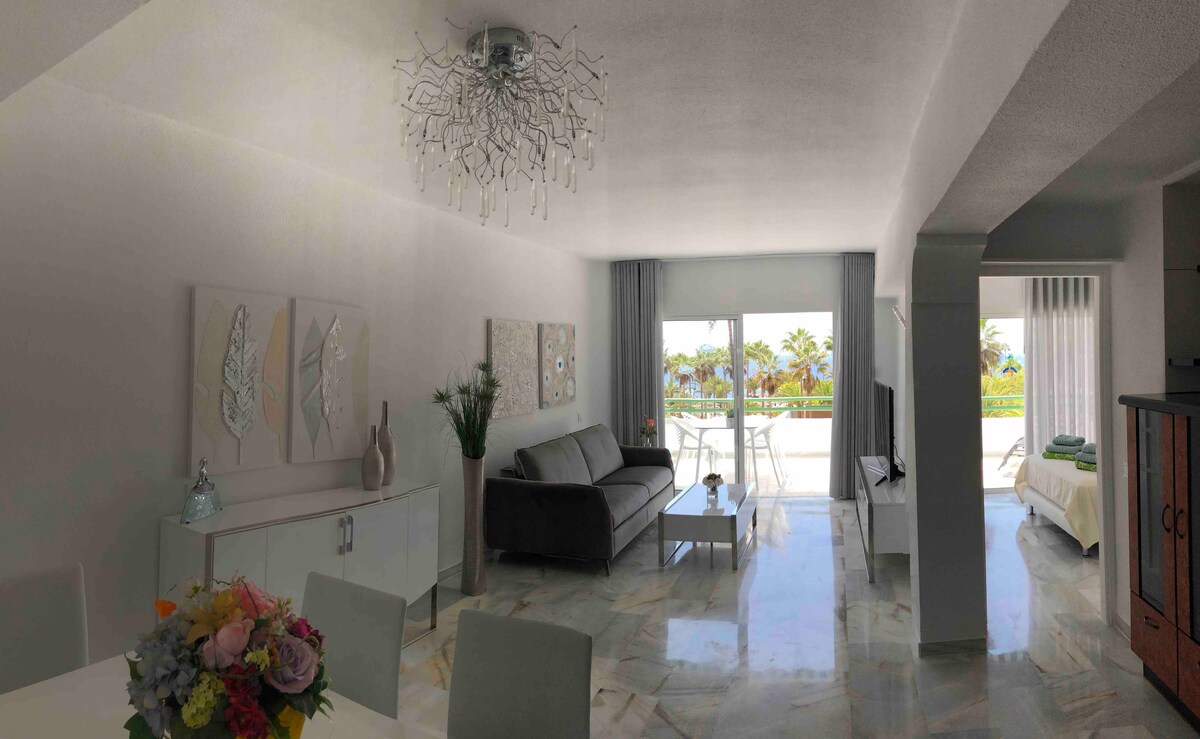 An exquisite apartment with a private terrace, offering breathtaking views of the ocean. Nestled in the renowned El Beril resort, just 10 meters from the sandy Playa del Duque beach and a picturesque promenade perfect for evening strolls. This ground-floor gem boasts its own terrace, granting direct access to the first line of the coastline. Surrounded by a myriad of restaurants and in close proximity to the luxurious 5-star El Mirador hotel, this location is a mere 3-minute walk to the beach.