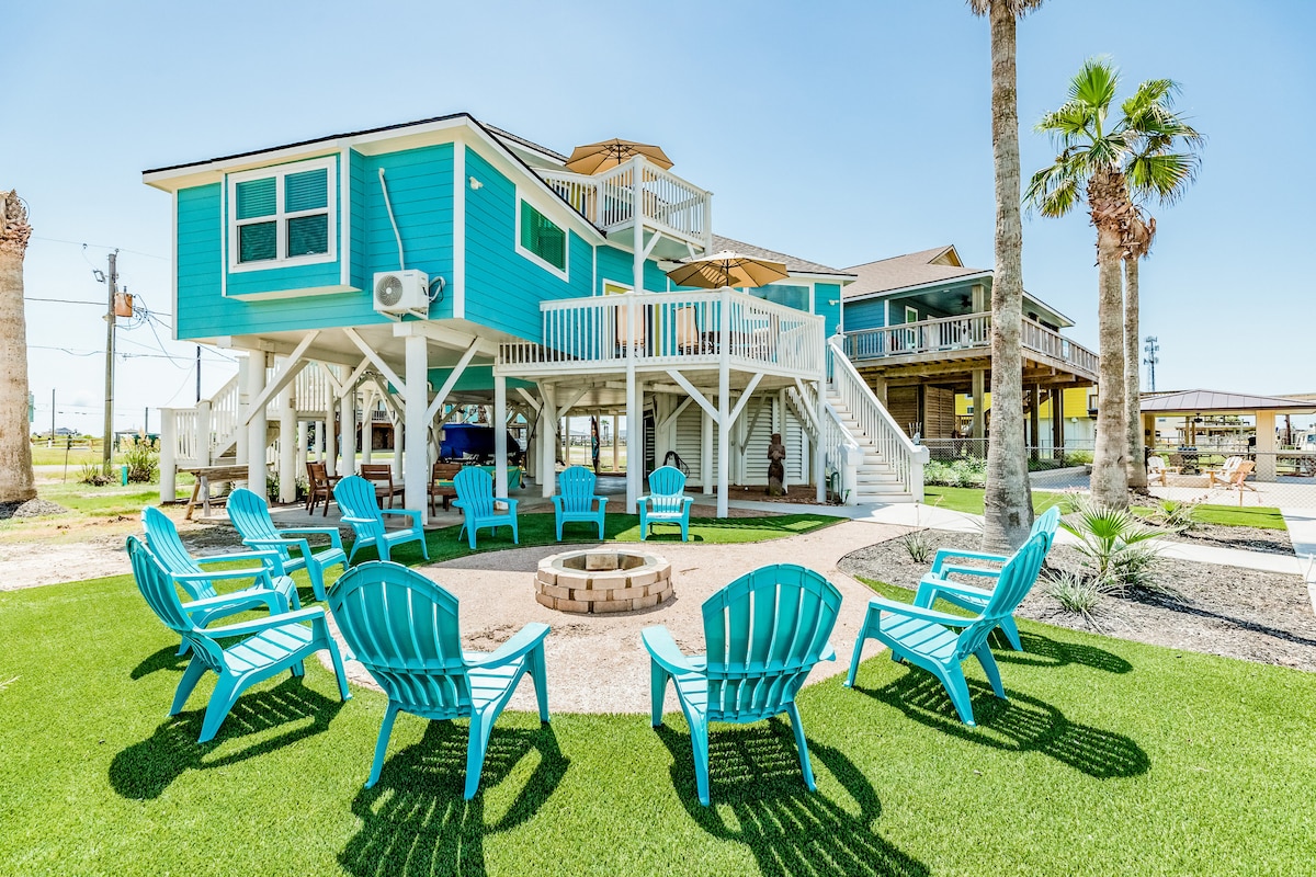 Our Kemah Bay Retreat is only a 2-3 minute walk from the Kemah Boardwalk and Lighthouse District! You're steps away from family entertainment, shops, restaurants and bars. At the waterfront house, enjoy the sight and sound of the bay from boats and birds passing by. Get on the water with provided kayaks and explore the coast. Fish from our private 216-ft pier. There's an elevator, EV charger, foosball, ping pong, basketball, arcade, outdoor chess/checker and cornhole game.