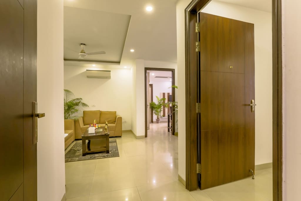 *Sanitized Homes* Under My Roof Serviced Apartments - Award Winning Homes. Private non-sharing 3 Bedroom Flat on first floor at Green Park, AIIMS & Safdarjung Hospital in Green Park. Cozy bedrooms with attached bathroom, separate living room with dining area & full kitchen - stovetop gas, refrigerator, microwave, electric kettle, cookware etc. Cleaning, linen, High-speed WiFi Internet, Tata Sky TV, Washing Machine included. 5 mins from hauz khas village & Dilli Haat - Prime Tourist Area!