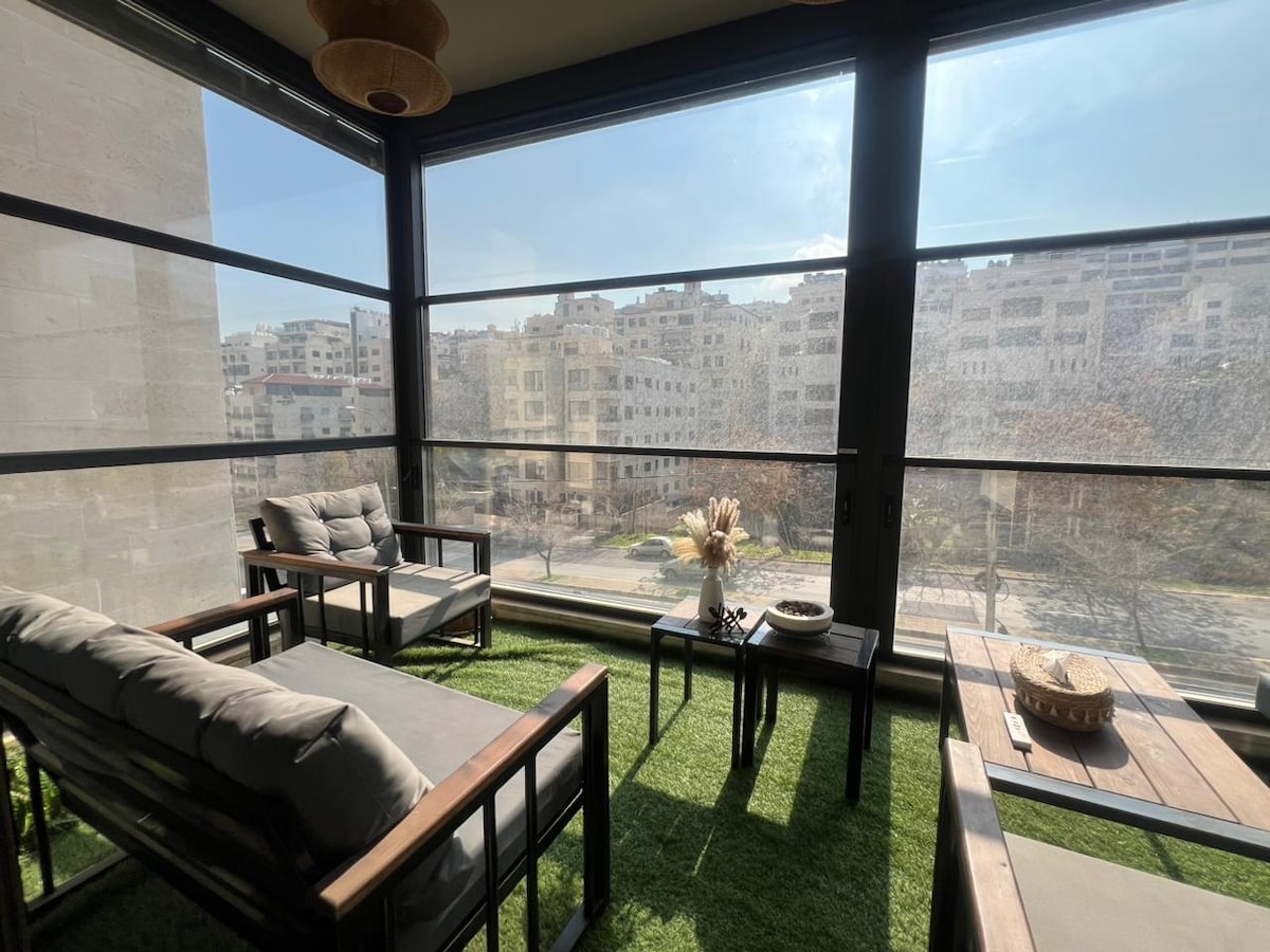 Stay in a fully renovated, stylish one-bedroom apartment in the heart of Sweifieh, Amman. Located on the first floor with keyless self check-in, it's perfect for solo travelers or couples. Enjoy a modern living space, full kitchen, luxury bathroom, glass-covered terrace, king-size bed, fiber internet, and smart 55" TV with VOD. Steps from top shops, malls, cafes, and main roads. Comfort, privacy, and convenience — your home in Amman!