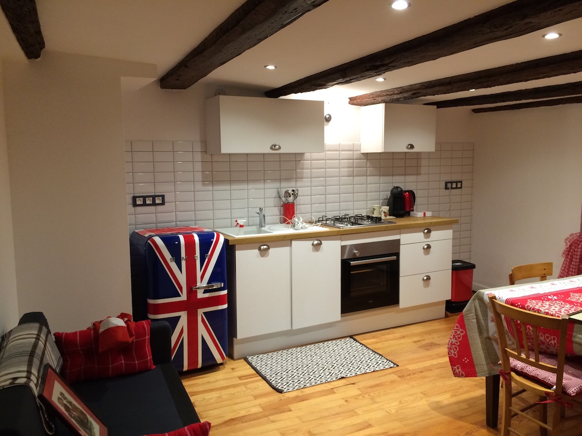 Fully renovated apartment in a detached house in Kaysersberg, voted the most beautiful village in France. Fully equipped kitchen (Nespresso machine) Living room with leather corner sofa with chaise longue, 1 bedroom (bed: width 160). Spacious bathroom with walk-in shower and toilet. Very quiet. Private entrance, Free parking in front of the house. Outdoor area with garden furniture and BBQ, fenced. Linens, towels, toilet paper, soap and shower gel are provided.