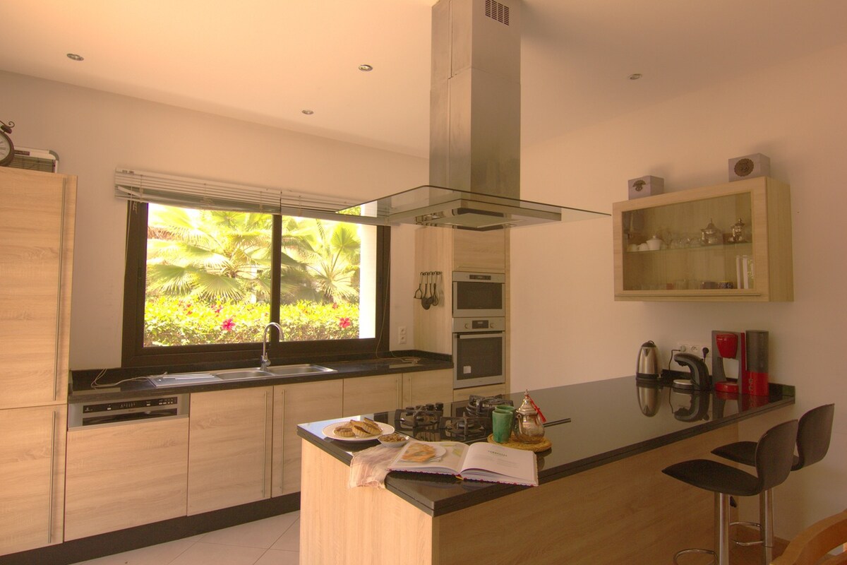 Beautiful 120 m2 villa on 550 m2 of land, comprising 2 bedrooms, 2 bathrooms, large enclosed garden not overlooked by neighbors, private 4*8 m pool, large covered terrace. Patio. You will enjoy full amenities, kitchen with microwave, oven, dishwasher. The villa has wifi, washing machine and everything you'll need for a perfect vacation. Located in the secure Dyar Shemsi area, you can enjoy a shared parking lot, 300 m2 shared swimming pool, gym, etc.