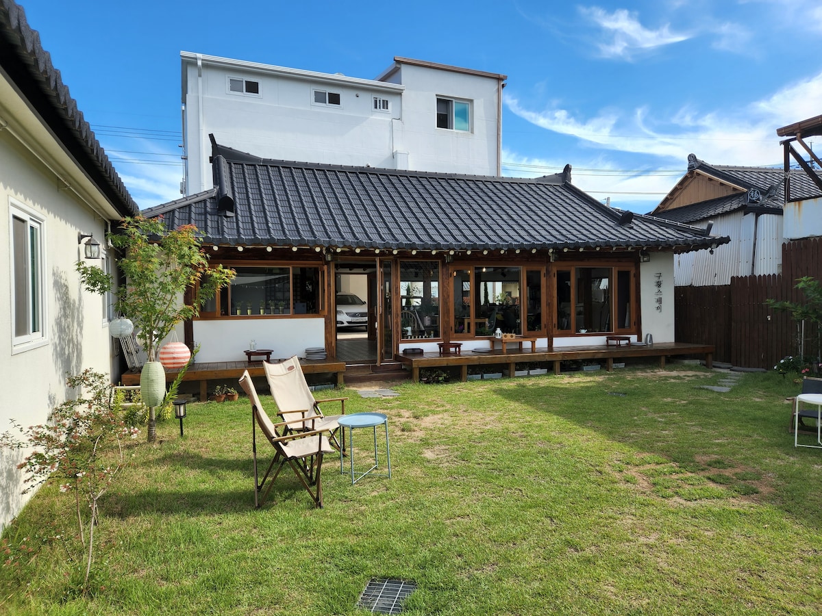 ✨[5min to Hwangridan-gil] Private Hanok Stay w/ Jacuzzi Stay at “Gruzam,” a modern yet traditional Hanok house in the heart of Gyeongju. Just 5 mins from Hwangridan-gil & Daereungwon & Chumsungdae 🏡 Private house for up to 6 guests | 2BR·2BA, king beds ♨️ Jacuzzi, 📶 Wi-Fi, 📺 Smart TVs (60”/75”) 🚗 Free parking, 🚭 Non-smoking indoors 💨 Dyson Airwraps, 🧴 full amenities, 🍪 snacks & morning dessert Perfect for families, couples, or friends!