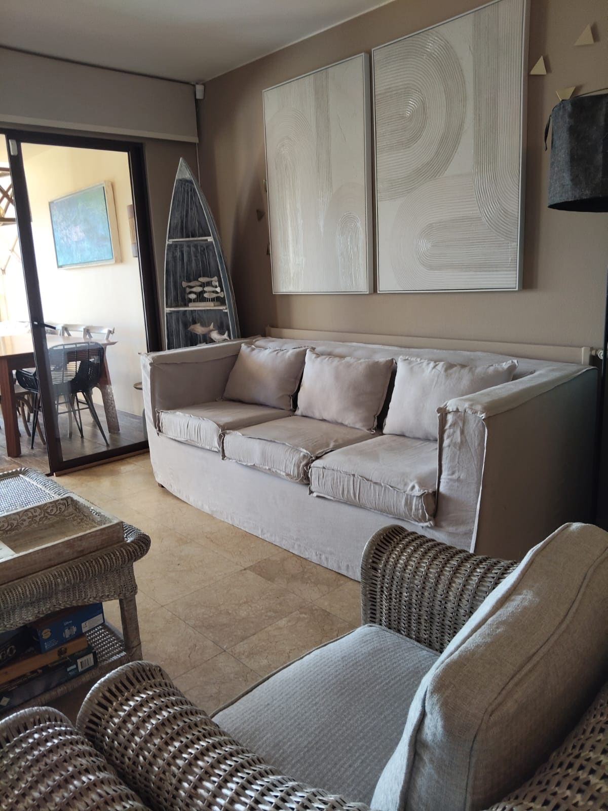 First floor apartment, second line. Newly renovated and fully-equipped. Sleeps 6-7 pax. Two bedrooms and two complete bathrooms. Master bedroom with double bed and another with a nest bed and a cabin. Sofa bed in living room. Washer-Dryer, Dishwasher and Microwave. Bose music equipment, Roomba vacuum and TV in master bedroom and living room. Digital lock. Full terrace with dining area, ocean and garden views. Next to the pool. Private parking area.