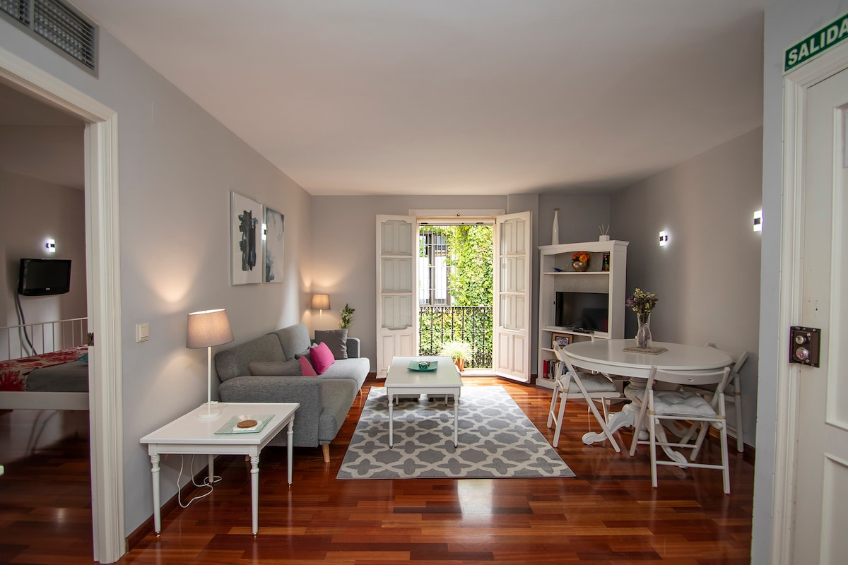 Magnificent apt. in the heart of the city, in the Santa Cruz neighborhood, 6 minutes from the Cathedral and close to all. Bright, quiet, spacious and comfortable; It has everything you need to make you feel at home ... and much more! It has a dining room-living room, a bedroom, bathroom, and kitchen. It has two balconies that provide a lot of light. Centralized A/C. All the visits can be done on foot. PARKING closed (from €18/day) Consult Possibility of cot and high chair. Consult. Welcome !