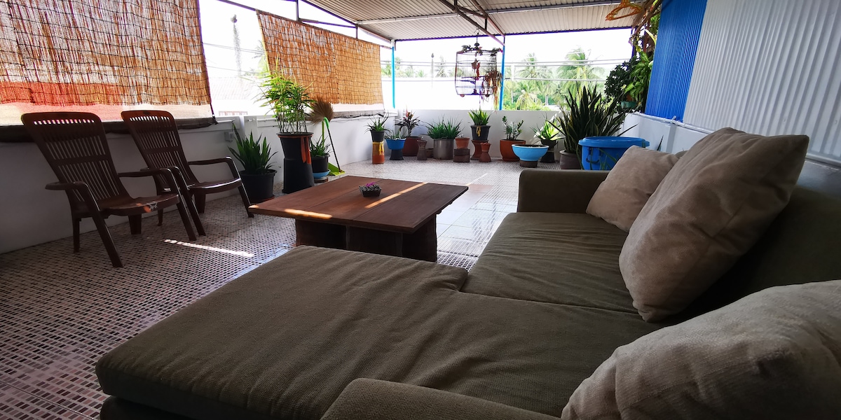 Room with terrace on the 2nd and top floor of a townhouse, in the center of Thong Sala, 700 m from the main dock. You'll be the only guests in the house. The room is simple, comfortable, king size bed, TV, mini fridge and air conditioning. Direct access to a large private terrace, with sofa, not overlooked, a little noisy during the day, but full of charm. Perfect for chilling or doing yoga. No party zone. You are welcome, Mi casa es su casa :)