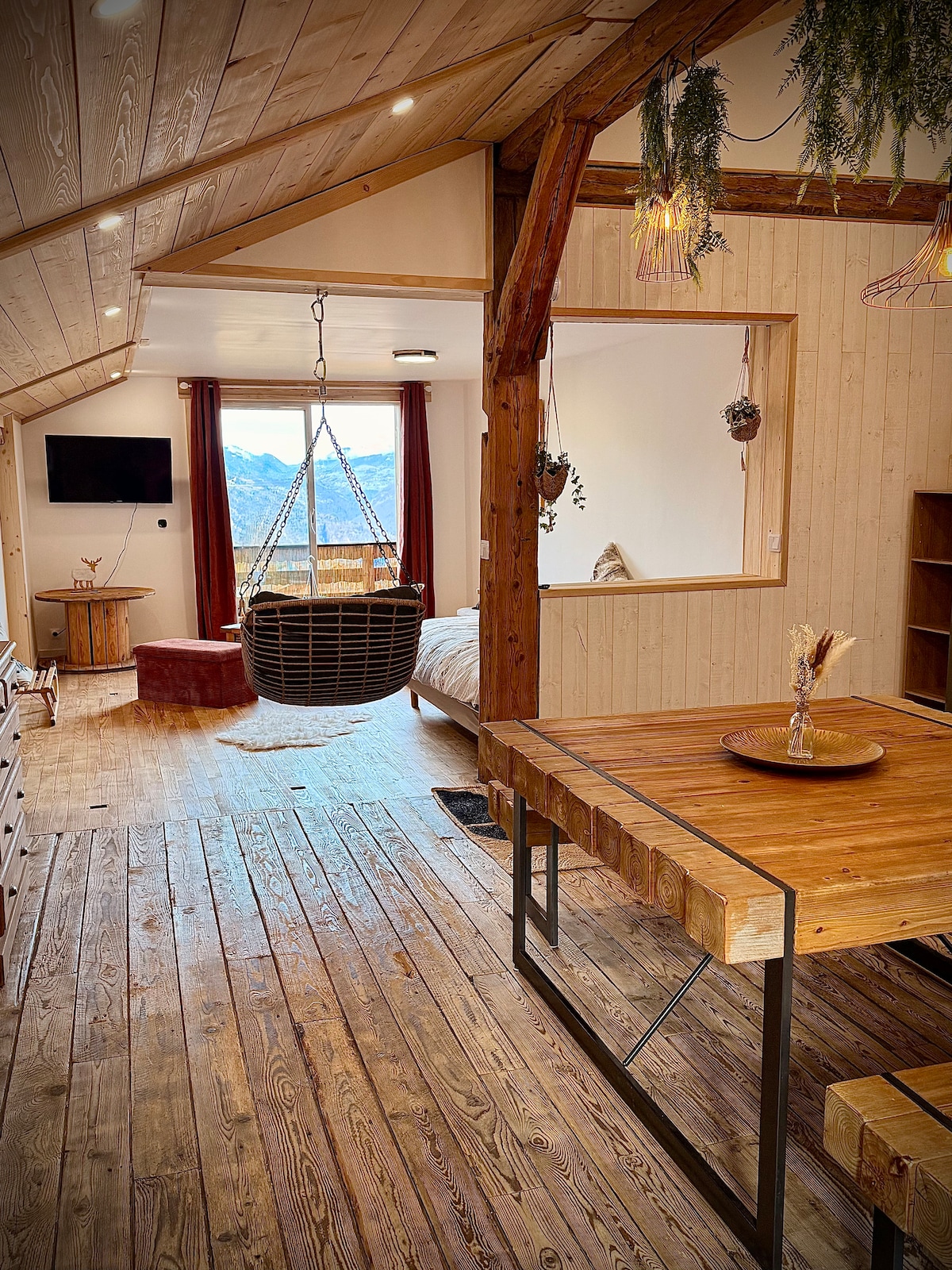 Cozy and authentic loft of approximately 100 m2 in a chalet built in 1811 with breathtaking mountain views, unique decor, and a warm atmosphere. You will appreciate this haven of relaxation during your stay. Ideal for 4 people. Close to shops (Thônes 4km), the Aravis ski resorts (La Clusaz/Grand Bornand, Manigod 15km), hiking trails, and Annecy (20km). Enjoy the comfort and tranquility of the surroundings. Pets (1) are allowed upon request and with a daily supplement.