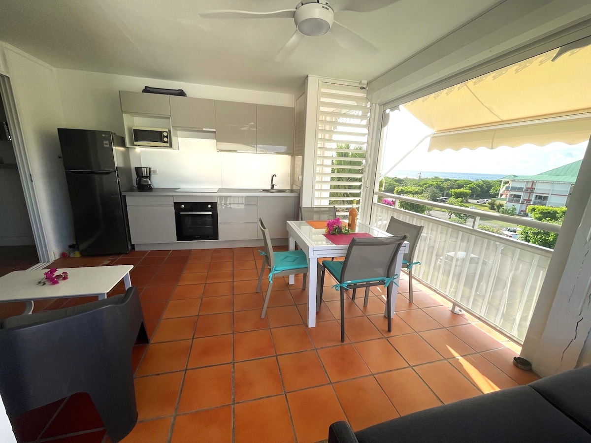 In Anse des Rochers, close to the seaside resort of Saint-François. Residence with a 1300 m² infinity pool, a beautiful private sandy beach and a restaurant. BFG IMMOBILIER presents: Studio of 34 m², 50 m from the beach, completely renovated, air-conditioned bedroom (1 double bed + 1 single bed), shower room, separate toilet, kitchen on terrace, induction cooktop, refrigerator with freezer, flat screen, Wi-Fi, air conditioning, tank. Sheets and towels provided.