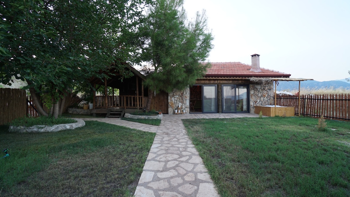 The stone house with a view of Tahtalı Mountain is on 4 acres of land. The house, which has a hydro-massage bathtub on its large patio, is suitable for people who want to have a quiet holiday in nature. The house is 6.5 km from the Olympos coast and 10 km from the Adrasan coast. There is another stone house 60 meters away on the same land. The other house is registered on Airbnb as 'Stone House with Forest and Mountain View in Olympos'. Two houses can be rented to large groups.