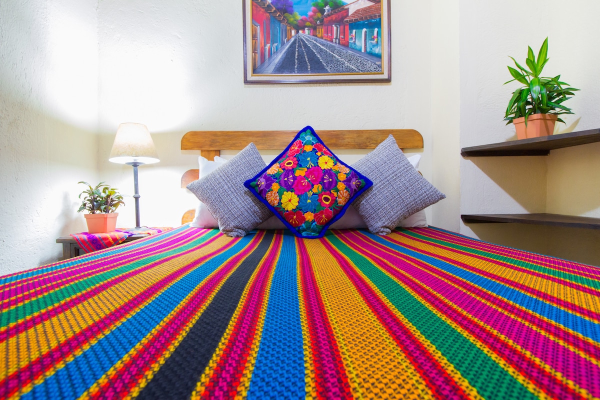 Te brindanos un ambiente agradable, donde puedes descanzar tranquilo y comodo, contamos con areas para trabajar y así disfrutar del fácil acceso a tiendas, mercados tipicos, restaurantes, bares y museos populares, desde este encantador lugar para hospedarte, dentro de la Ciudad Colonial más Hermosa de Guatemala, llena de cultura y tradición. Nota: la Habitación es para 4 personas y se remodelo, ahora tiene 2 camas matrimoniales, no cuenta con 3 camas como antes.