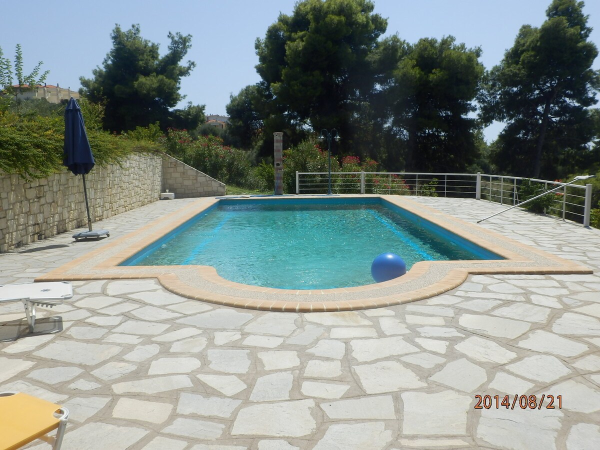 Villa into Sani's pine woods forest. 20' on foot from Koutsoupia beach, Sani beach, Sani Resort and Marina. Garden and balcony in addition to the unique scenery to spend quality time with your loved ones. Private parking spots: 2 The unique position of our villa ensures that you get both the relaxation you seek but also you can have all the amenities that Sani Beach Provide.