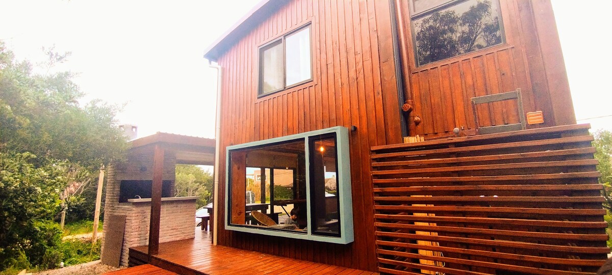 Warm two-story wooden house on the beach in Punta Rubia, a quiet neighborhood on the dunes and meters from the sea. La Pedrera is 1 km away and Cabo Polonio is 37 km away. The promised beach! The house has a living room, an integrated kitchen, and a full bathroom on the ground floor. In PA, 2 bedrooms. One with a double bed, with access to the deck seen in the photo, and another with a single bed and two armchair beds. The living room armchair can also be converted into a bed. Outdoor grill. Enjoy!