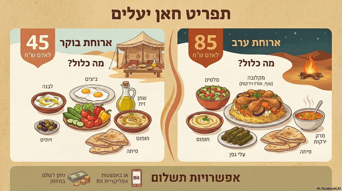 Unique glamping for couples with an amazing view of the desert and the city of Arad. In the complex there is a special glamping tent insulated from heat and cold. A luxurious air conditioner and a luxurious indoor bathroom and a huge, shaded deck terrace. Outside there is a seating area, a place to light a fire, an outdoor kitchen and a luxurious gazebo in the warm season (March-October) Right from the yard you can go to walking trails around Arad, streams and the Dead Sea view that is right around the corner. We did everything, from planning, to building, to designing, and everything was done with a lot of thought and love. Meals can be ordered for an additional fee and there are a variety of dining options in Arad and the surrounding area.