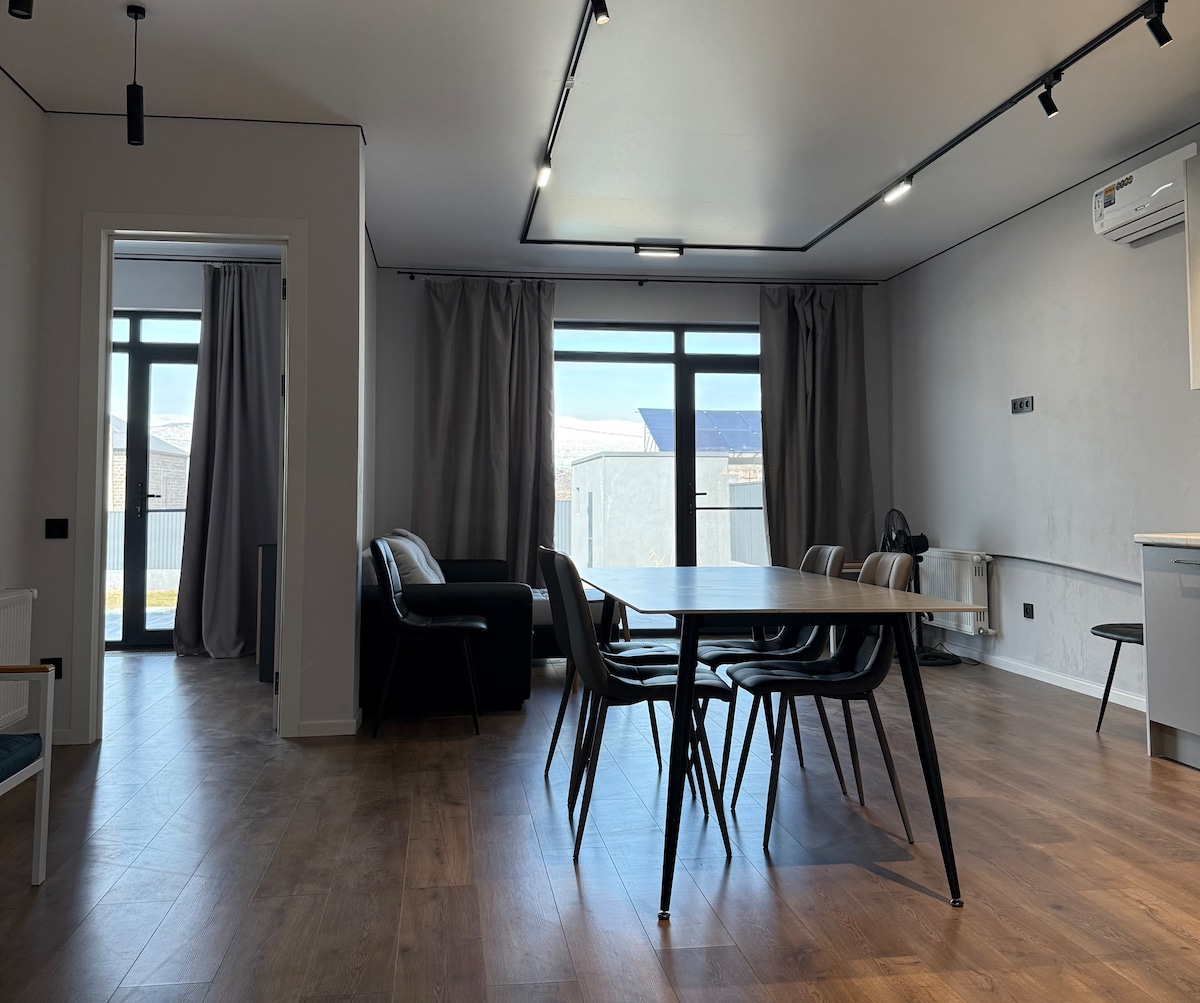 Discover our beautifully renovated apartment situated in a serene residential neighborhood. Enjoy the tranquility of the green recreation area, offering a view of the capital, the stunning Mount Aragats, and a nearby water park. The city center is just a short 4-5 km drive away. What's more, our strategic location grants you close proximity to the vibrant Megamall, a charming zoo, and heart-pounding adventures at water parks and sports complexes that will leave you thrilled.