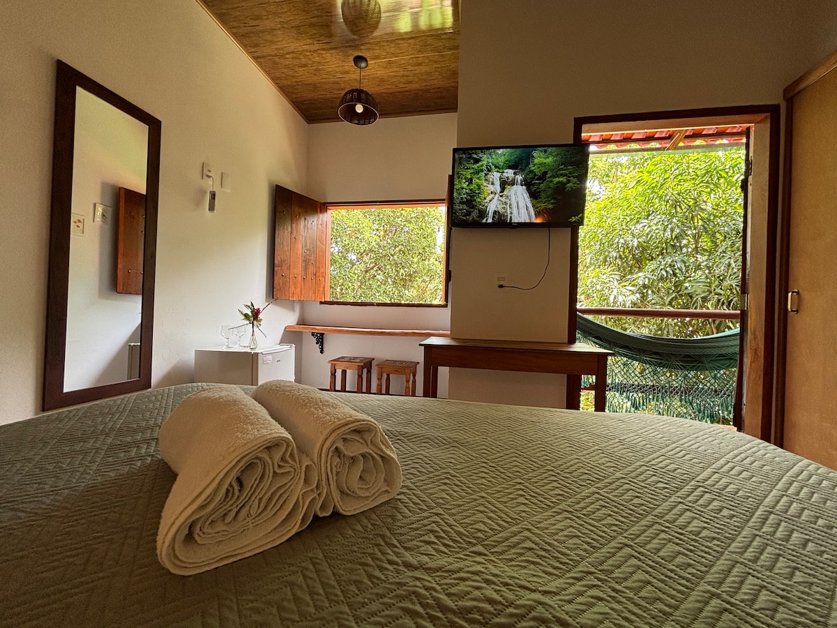 A Suíte do Bonfim conta com 1 cama tamanho Queen, frigobar, ar condicionado, arara, cortina blackout, lençóis de algodão, toalhas e varanda privativa com rede.