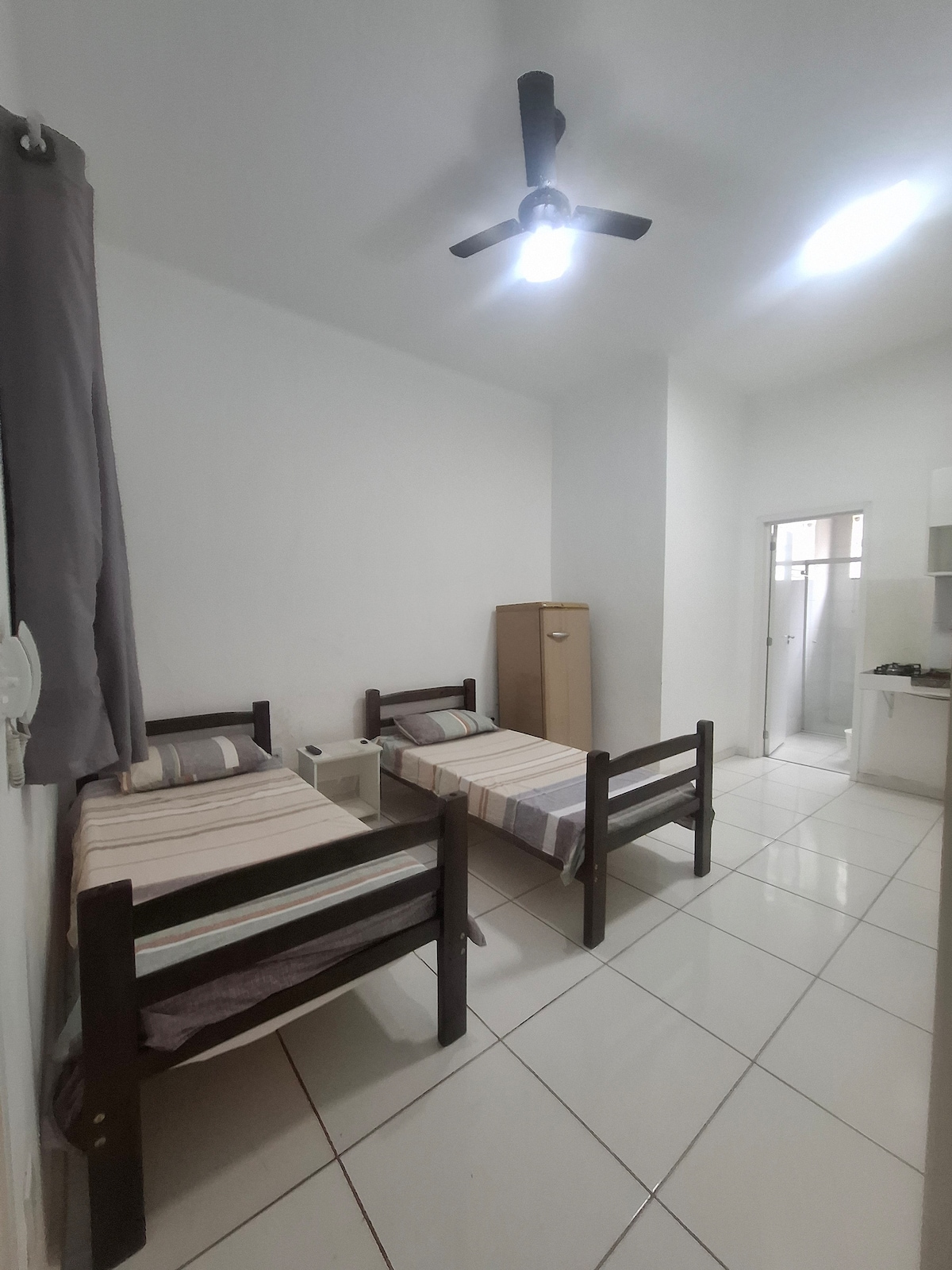 Studio contém ar condicionado, geladeira, TV, purificador de água, cama de casal, guarda-roupas, fogão elétrico, podendo ser utilizada área de coworking, sala de jogos, academia, bicicletário, garagem (rotativa), sala de cinema, máquina de lavar roupas e secadora (grátis ou paga).