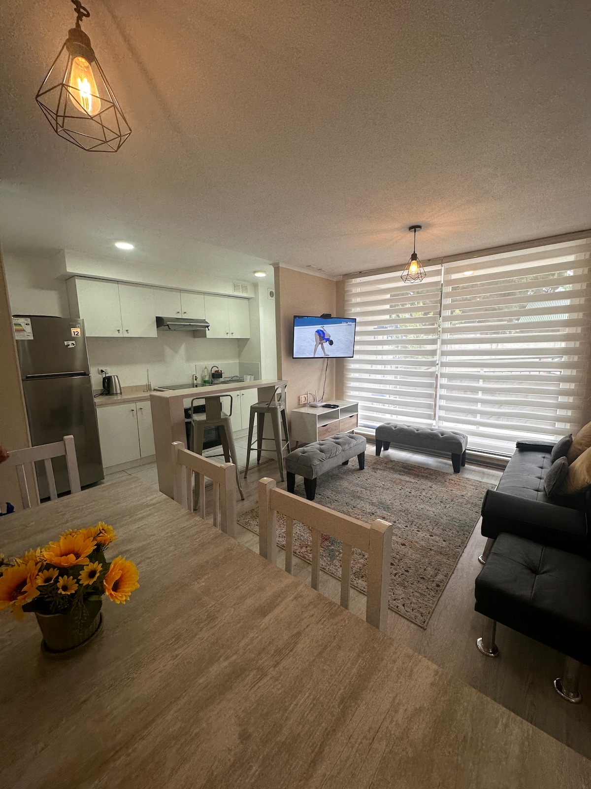 Departamento acogedor a 4 cuadras del centro de Temuco, ideal para parejas o viajes de trabajo. Decorado con pellines del Río Toltén y muebles de madera reciclada, combina diseño y calidez. Cuenta con cama King Rosen, espacio de trabajo, estufa a Pellet para inviernos fríos, mini balcón, 2 TV de 55”, cocina equipada y estacionamiento incluido. Cerca de Av. Alemania, Mall y Parque Isla Cautín. Todo caminando en minutos. Un espacio pensado con cariño para que te sientas realmente como en casa. ✨