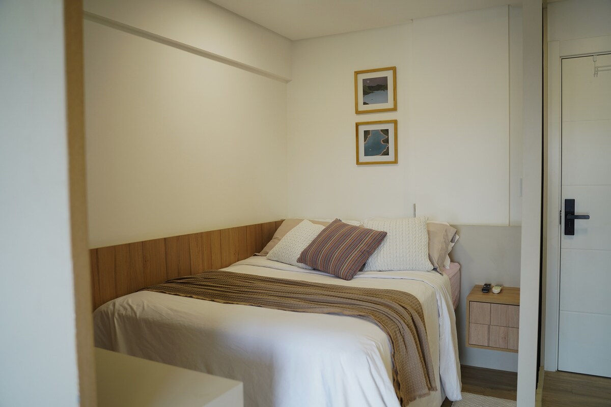 The One Ecovile studio is located in the Ecovile neighborhood. The studio has a small kitchen where guests can prepare their meals with all the necessary utensils. It has a space with a workbench and an armchair for working. It also has a bathroom with shower. The bed is a full bed with a super modern built-in system. Super easy to lift when not in use. We prioritize this system so guests can optimize space.