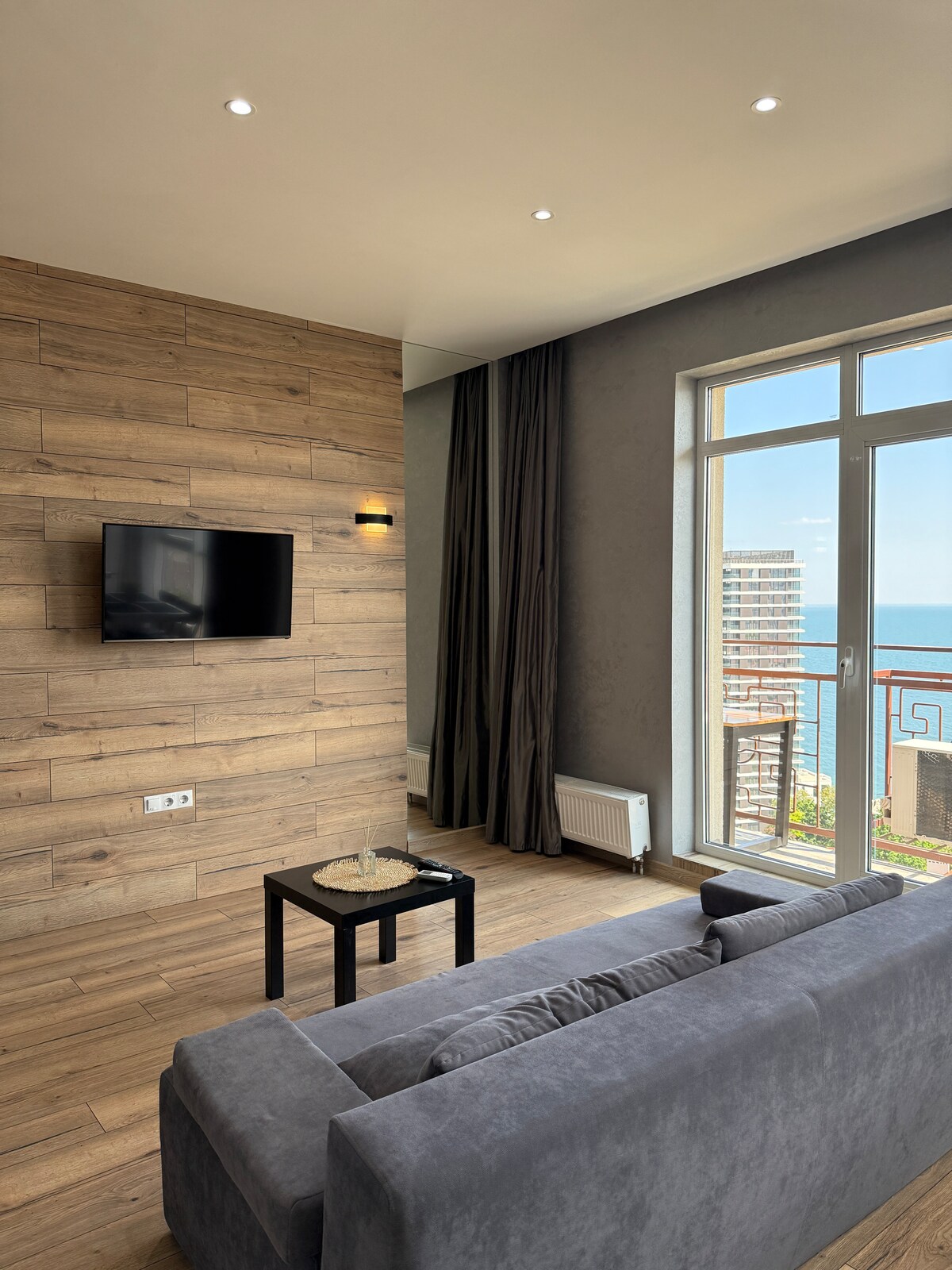 Have a great time with the whole family in this stylish and cozy home. The new apartment is located in a residential complex by the sea, for your convenience we provide a free parking space, from where you can take the elevator to a bright apartment with a balcony. For your convenience, we provide all the necessary household appliances, utensils and hygiene products. The kitchen is in Italian style and the bedroom is filled with soft light where you can relax and recharge