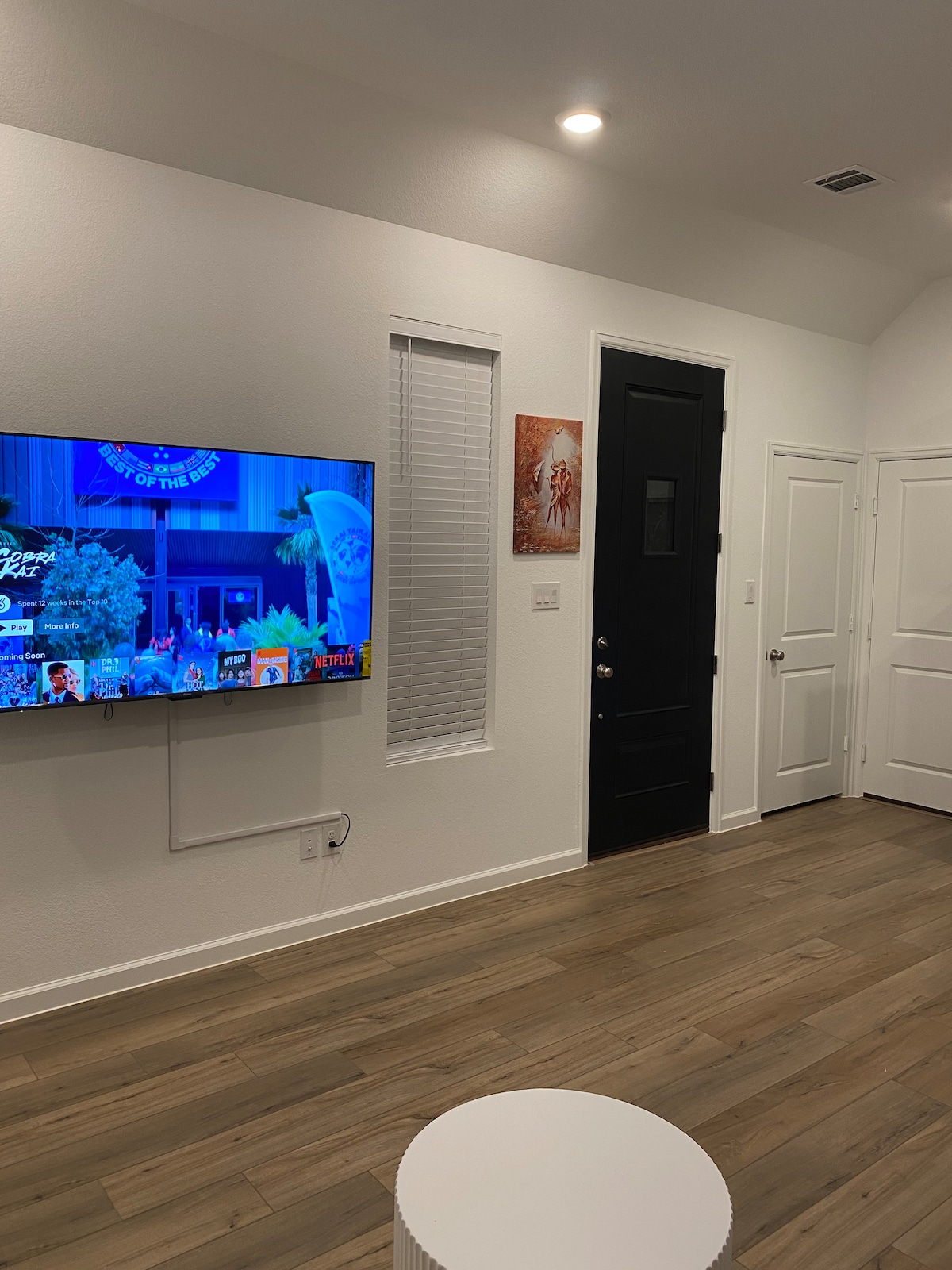 Relax in this spacious, modern suite just 25 minutes from Downtown Houston and 27 minutes from the Medical Center. Perfect for long stays, business travelers, or weekend getaways seeking comfort, style, and value. Features: - 2 comfortable beds (1 Queen + 1 Sofa Bed) - 65” Smart TV with Netflix - Fully equipped kitchen w/ coffee maker - High-speed WiFi - Two private entrances Amenities: - Free private garage parking with direct suite access. - In-unit laundry. - Desk & chair for work/study.