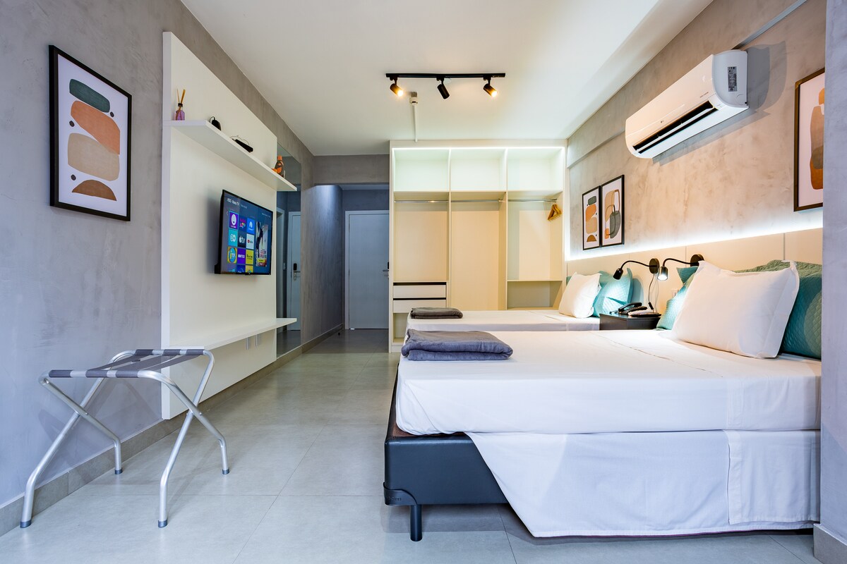 Comfortable space in the Northwest - prime area, close to Boulevard Shopping, supermarkets, bars, pharmacies, laundries and bakeries. With finely designed furniture in all environments, the space features televisions, air-conditioners, kitchen utilities, an oven, stove, refrigerator, microwave, sandwich maker, coffee maker, hairdryer, electric towel rack, work desk, double box bed and sanitized bed and bath linens. It includes private parking and a door with automatic lock.