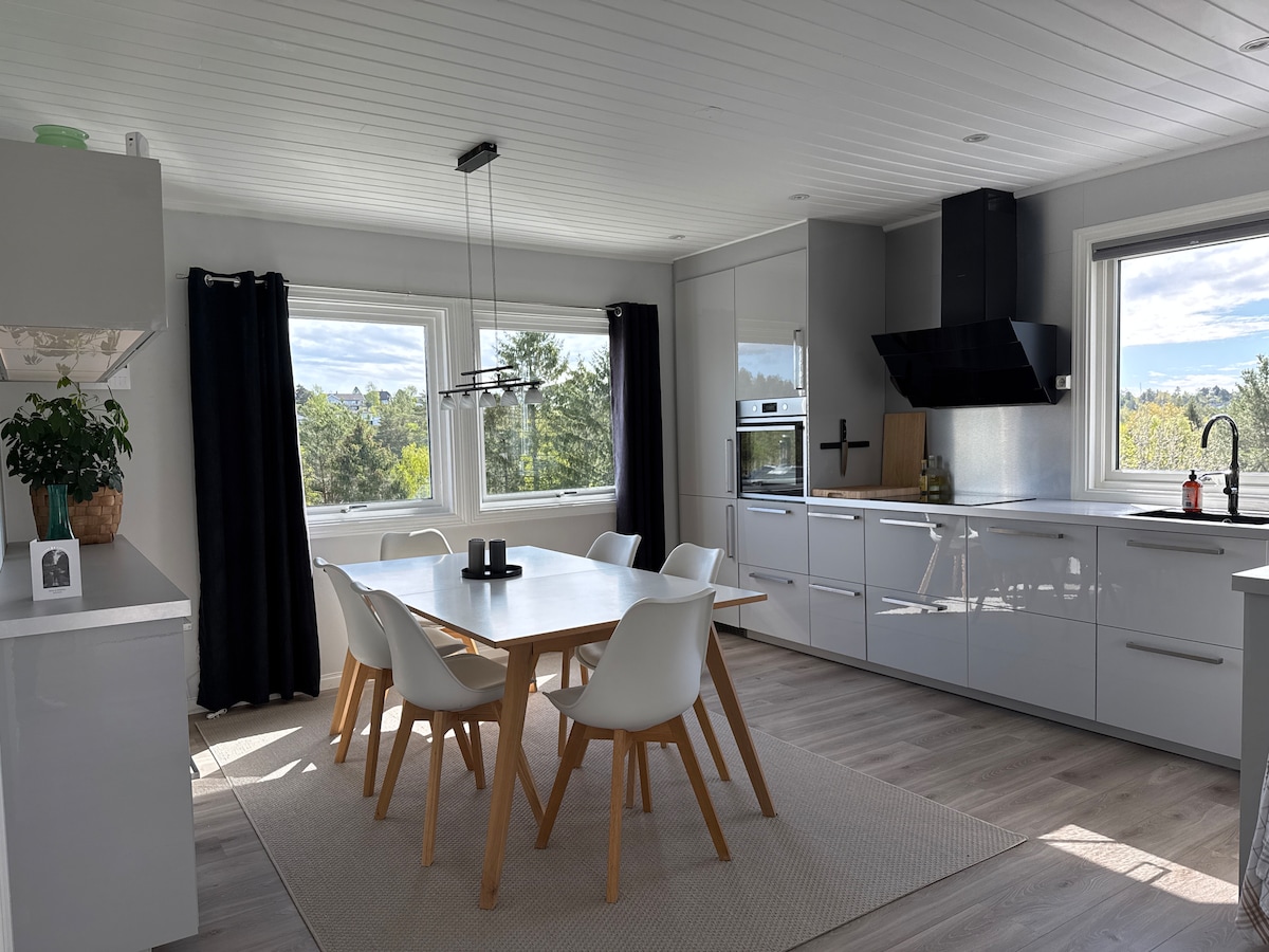 Modern, 170 sqm, right by the lake! Large private terrace. Good fishing conditions. Lots of windows overlooking the stunning lake view. Well-equipped kitchen, two ovens. Good space, airy feeling. 4 bedrooms, 1 sleeping alcove, 2.5 bathrooms. A few minutes walk into town. 20 min by car to Kristiansand Zoo. 2 Kayaks, a motorboat with steering wheel suitable for 3 people. Indoor parking space for car. Have your vacation in paradise with a relaxed atmosphere in Sørlandet, real Sørland idyll!