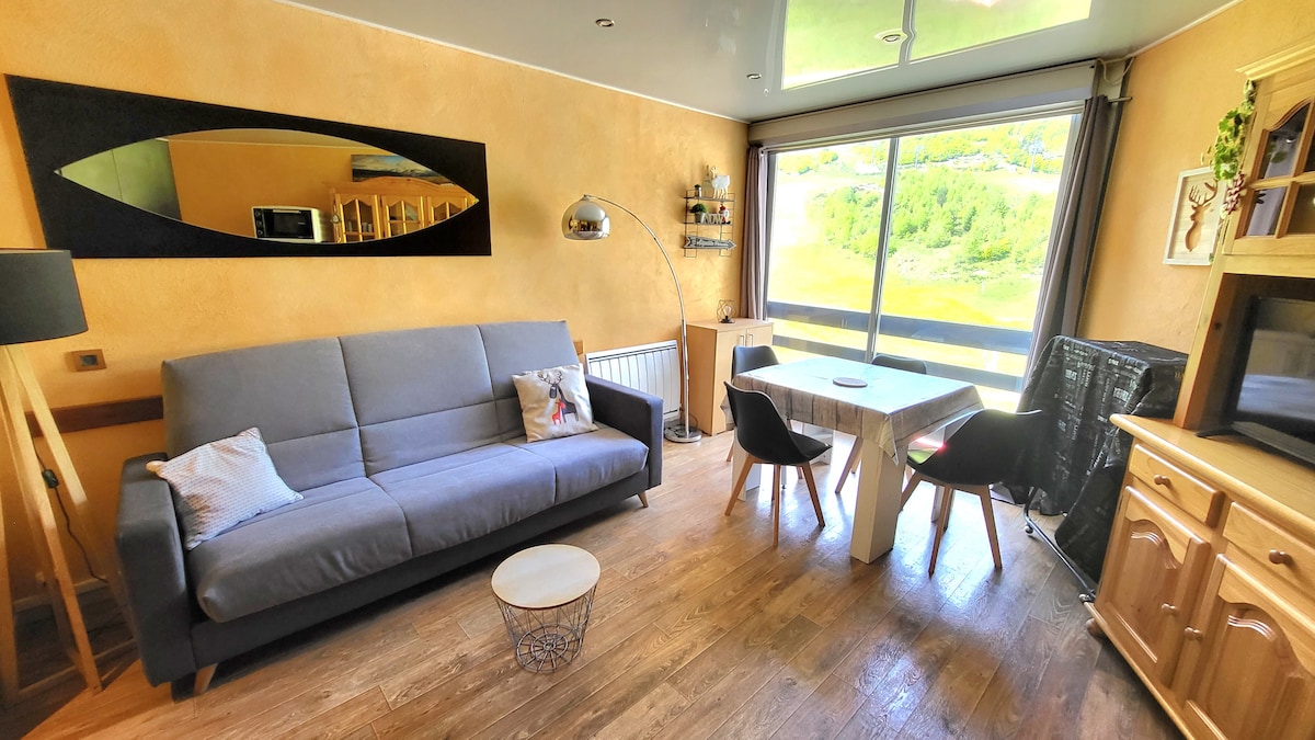Studio cabine rénové 11/2019, balcon fermé et volet roulant, 2ème étage ascenseur, vue magnifique sur la vallée. Au rdc, commerce, bar, restaurant, location, ESF.. Pistes au pied du bâtiment. NON FOURNIS linge de maison, de lit, draps, serviette, duvet. FOURNIS : couettes, couvertures, oreillers, rangements. Prix selon période+ conso EDF en hiver, relevé. Vacances fin d'année, hivers, réservation à la semaine. Epicerie ouverte saison ski, hors saison commerce dans la vallée. Parking. Local ski