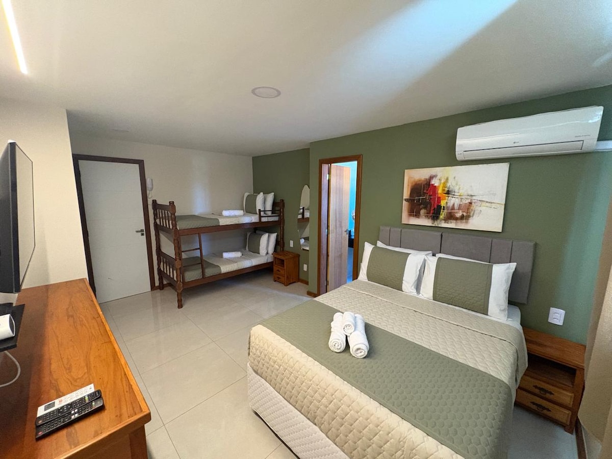 A apenas 300 metros da Rua das Pedras, esta suíte acomoda até 3 pessoas com conforto e praticidade. FA suíte está a 200 metros de lojas, mercados e farmácias, além de estar a poucos passos dos melhores restaurantes e bares de Búzios. Aproveite comodidades modernas e relaxe em um espaço acolhedor! A suíte disponibiliza 1 cama de casal e 1 cama de solteiro, além de roupa de cama e toalha de banho, além de frigobar, sanduicheira e cafeteira elétrica, copos e talheres!