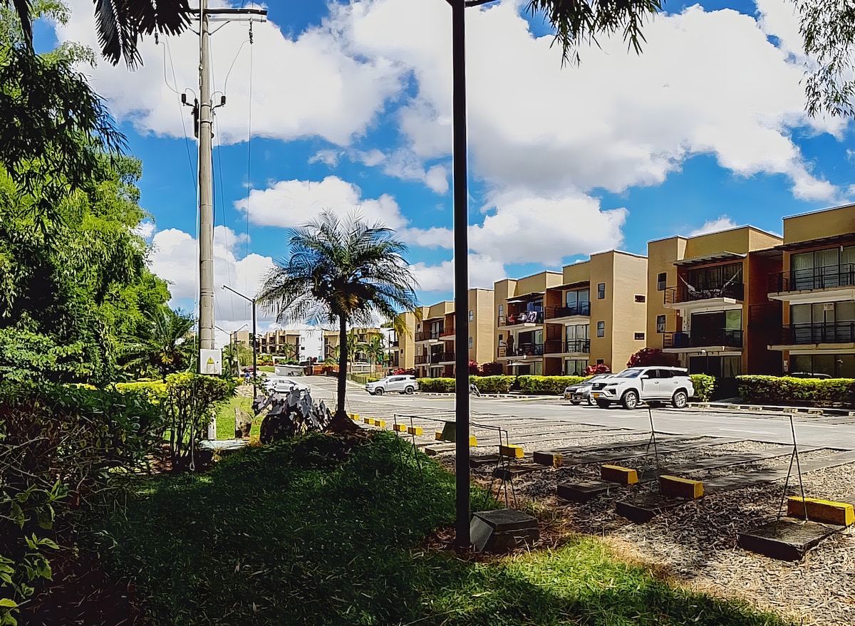 Sensational and elegant apartment-hotel surrounded by nature; fully equipped for a pleasant stay. You can enjoy a new, impeccable place with a fresh and cozy design; 24-hour surveillance. 5 minutes from the airport and 20 minutes from Parque del Café. Resort-style amenities: 3 pools, slide, children's games, jacuzzi, BBQ, washing machine. Strategically located to get to know the entire coffee region and cities such as Pereira (1h30m) and Cali (2h30m).